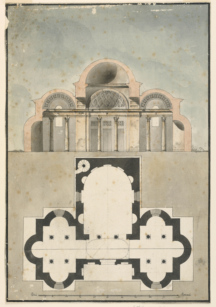 Drawing, Section, Small Domed Building; Italy; pen and black ink, rose, brown and blue wash, black chalk on paper, with fragments of blue paper framing; Museum purchase through gift of various donors and from Eleanor G. Hewitt Fund; 1938-88-7160