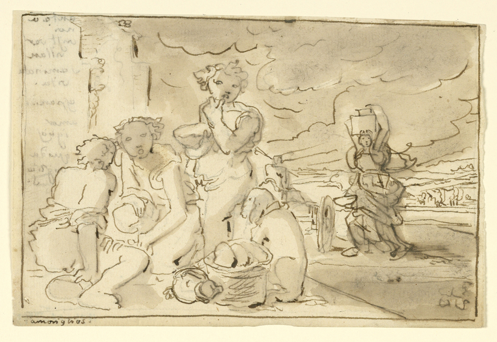Drawing, Street Scene With Figures; Fortunato Duranti (Italian, 1787 - 1863); Italy; pen and bistre ink, brush and wash on paper; 12 × 18.5 cm (4 3/4 × 7 5/16 in.); Museum purchase through gift of various donors and from Eleanor G. Hewitt Fund; 1938-88-7383
