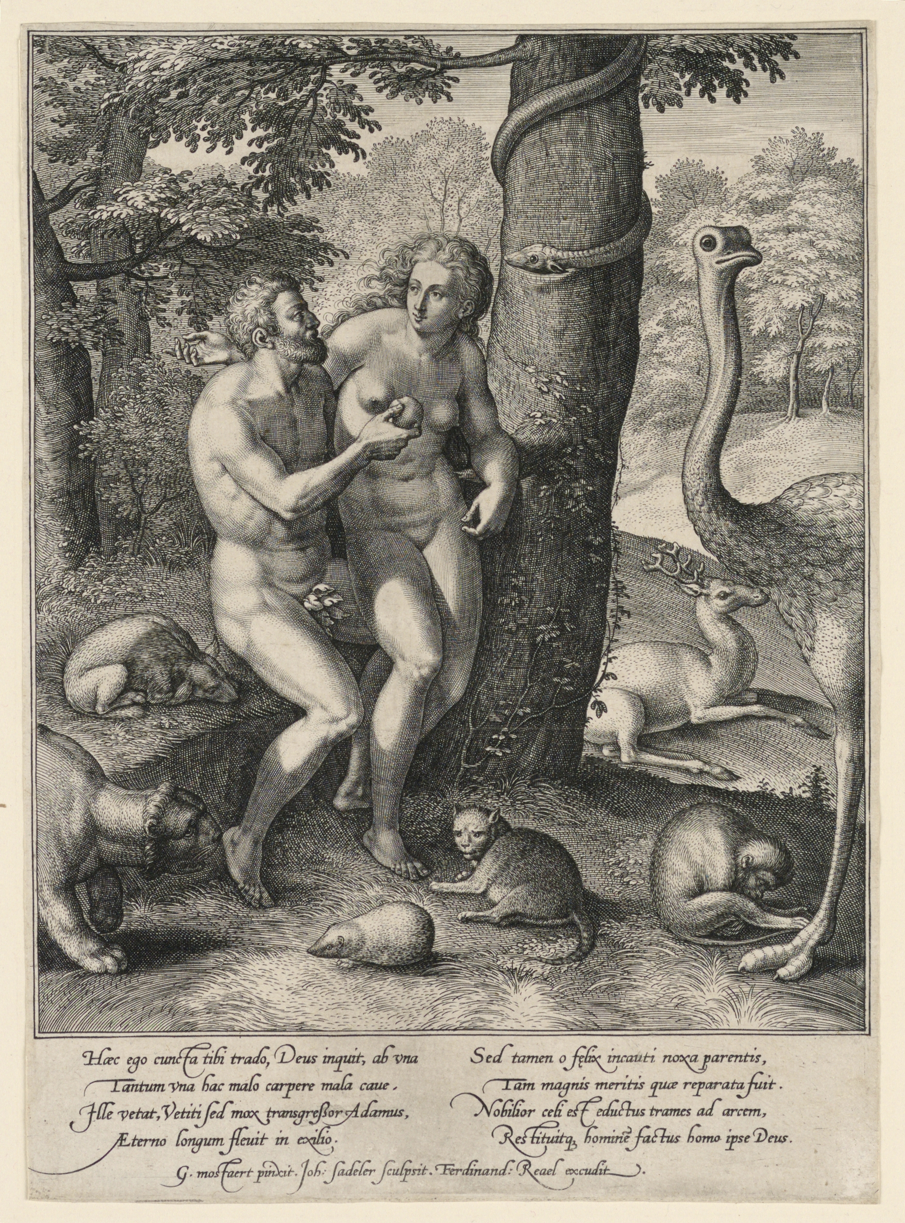 Print, The Fall of Man; Jan Sadeler, the Elder (ca. 1550 – 1600); After Gilles Mostaert the Elder (ca. 1534 – 1598); Netherlands; engraving support: white laid paper; 20.5 x 14.8 cm (8 1/16 x 5 13/16 in.) Mat: 45.7 x 35.6 cm (18 x 14 in.); Museum purchase through gift of various donors and from Eleanor G. Hewitt Fund; 1938-88-8615