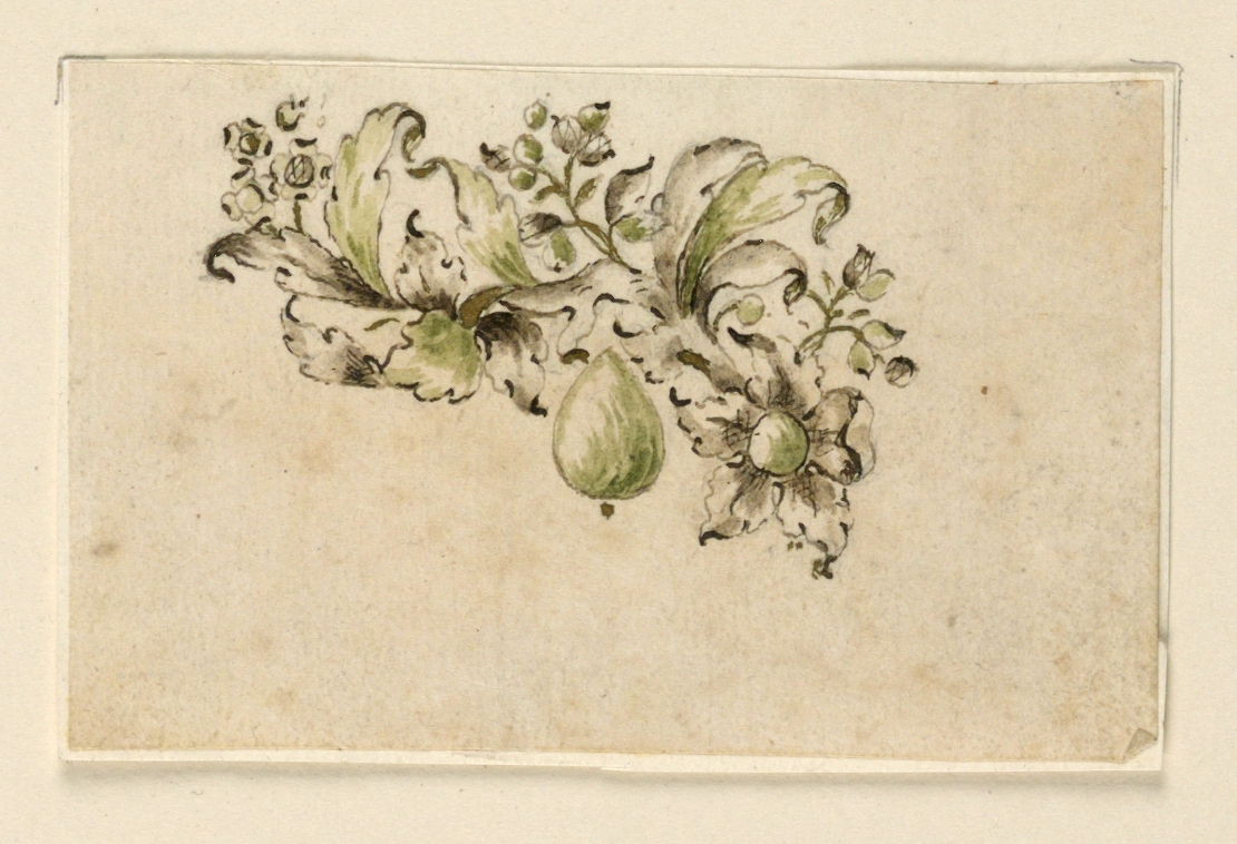 Drawing, Design for a Brooch; Italy; pen and ink, brush and sepia wash, green watercolor on paper; 5.6 × 8.2 cm (2 3/16 × 3 1/4 in.); Museum purchase through gift of various donors and from Eleanor G. Hewitt Fund; 1938-88-915
