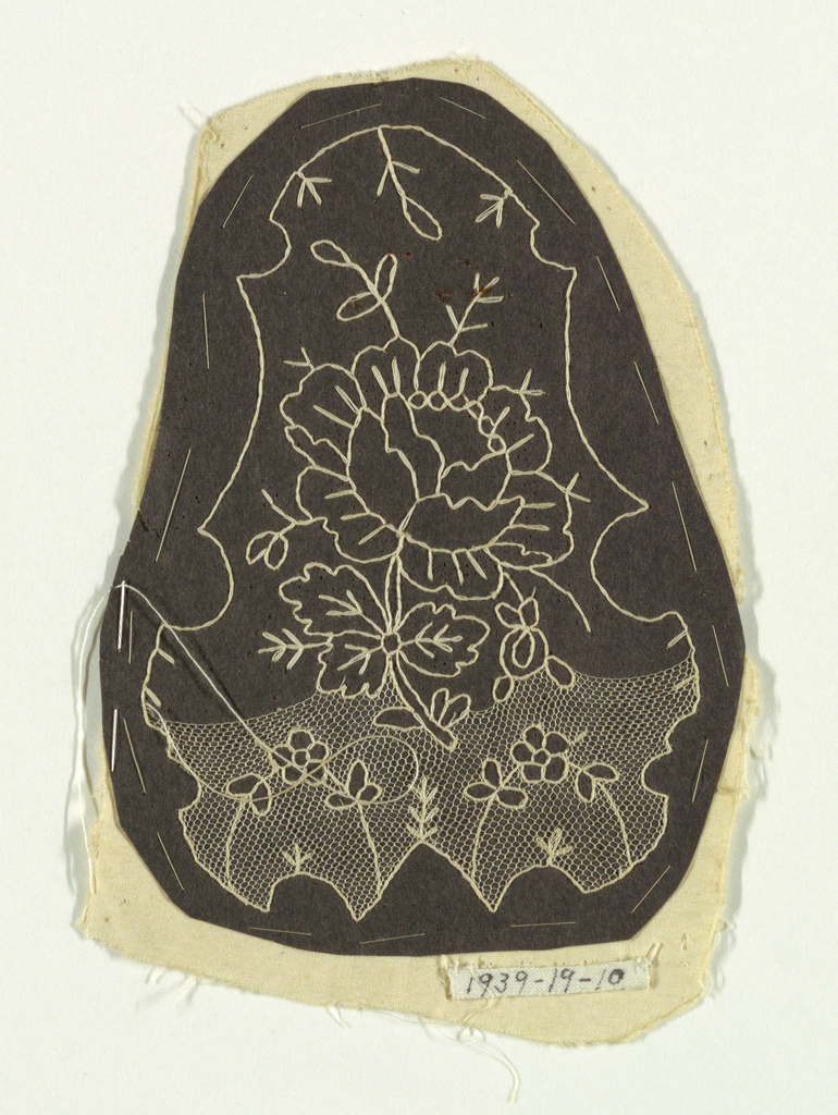 This is a Pattern with uncompleted lace. It is dated late 19th century and we acquired it in 1939. Its medium is paper, wool, linen and its technique is needle lace with ground of loop & twist with loop & twist return. It is a part of the Textiles department.