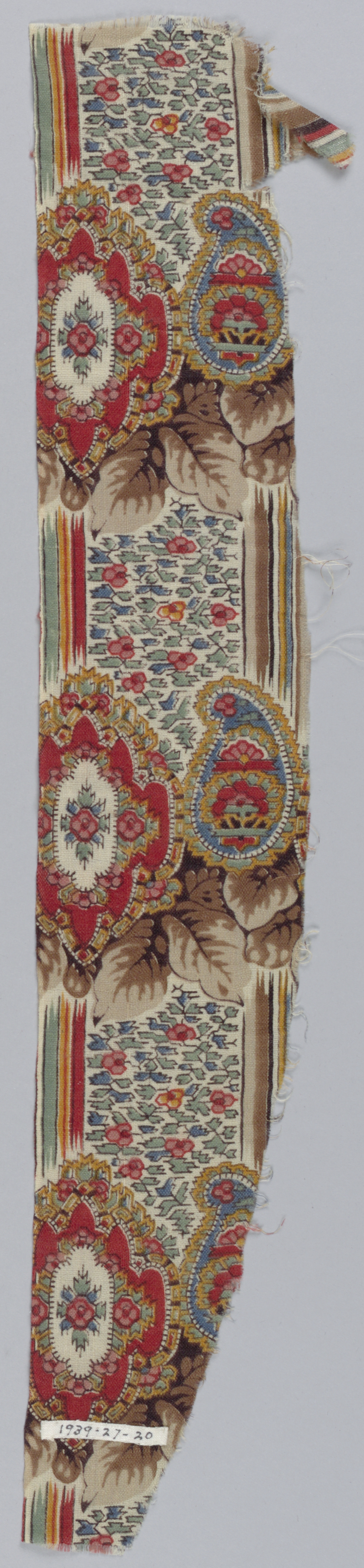 This is a Fragment. It is dated ca. 1850 and we acquired it in 1939. Its medium is cotton. It is a part of the Textiles department.