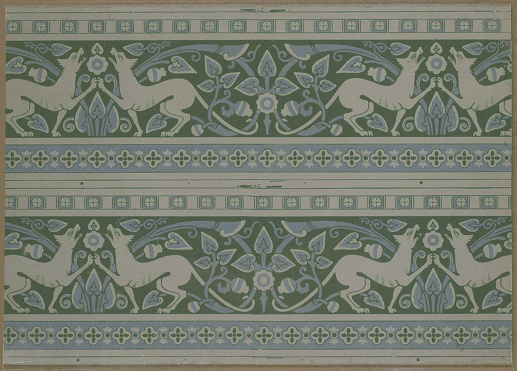 This is a frieze. It was designed by William Burges and published by James Shoolbred & Co.. It is dated ca. 1875 and we acquired it in 1940. Its medium is block-printed paper. It is a part of the Wallcoverings department.