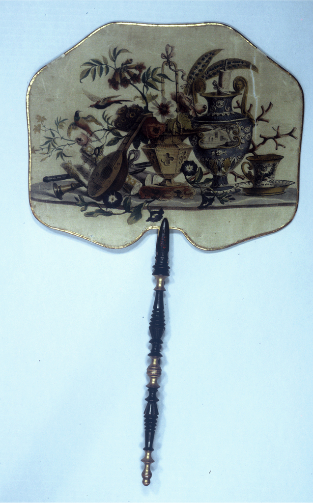 This is a Handscreen. It is dated early 19th century and we acquired it in 1939. Its medium is printed silk leaf, turned and gilded wood handle. It is a part of the Textiles department.