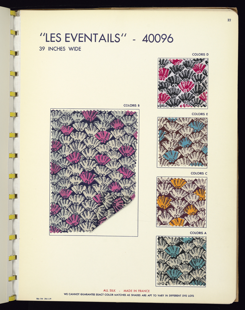 <ref name=CH>{{cite web |url=https://www-6.collection.cooperhewitt.org/objects/18557047/ |title=Sample Book (France) |author=Cooper Hewitt, Smithsonian Design Museum |accessdate=19 December 2025 |publisher=Smithsonian Institution}}</ref>