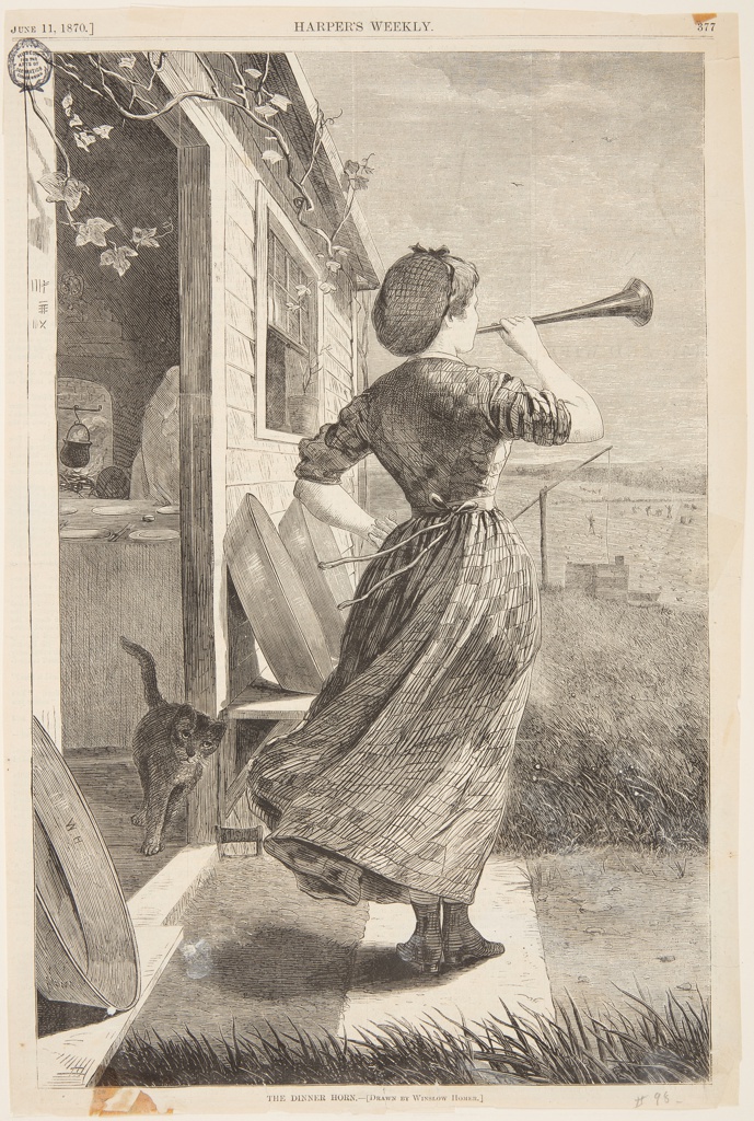 Print, The Dinner Horn; After Winslow Homer (American, 1836–1910); USA; wood engraving printed in black ink on paper; 37.1 x 25 cm (14 5/8 x 9 13/16 in.); Gift of Cora Wilson; 1939-70-5