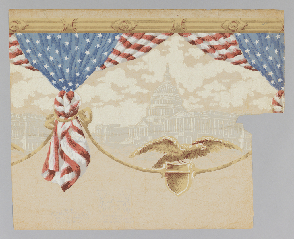Produced right around the turn of the twentieth century, the design sports stars and stripes-patterned bunting printed in bold red, white, and blue, with a view of the newly renovated Federal Capital building printed in more subtle shades of gray. And let’s not forget our national bird, the bald eagle, perched on a shield supported by a swagged cord.