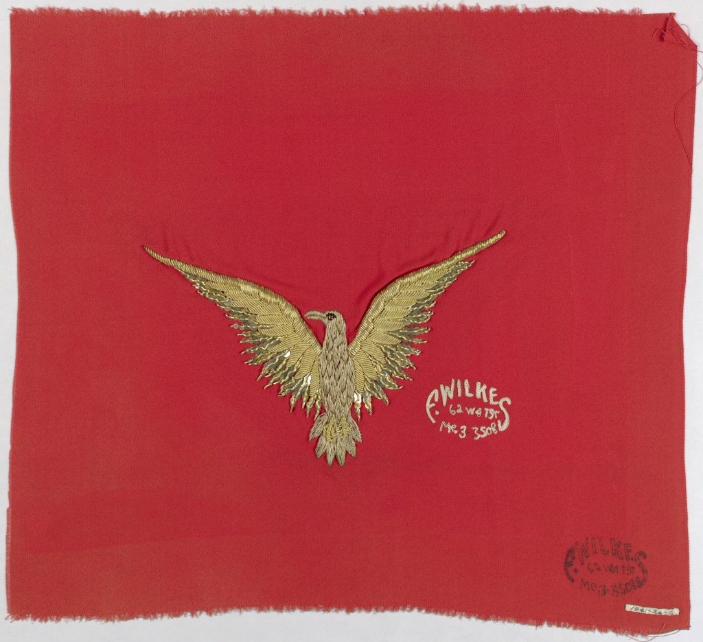 This is a Embroidery sample. It was made by F. Wilkes. It is dated early 20th century and we acquired it in 1941. Its medium is rayon, gilt thread, spangles and its technique is machine embroidered. It is a part of the Textiles department.