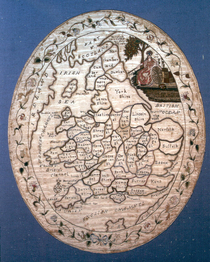Map Sampler, A Map of England and Wales; Embroidered by H. Havens; England; silk and linen embroidery on linen foundation; H x W: 55.9 × 46.7 cm (22 × 18 3/8 in.); Bequest of Mrs. Henry E. Coe; 1941-69-121
