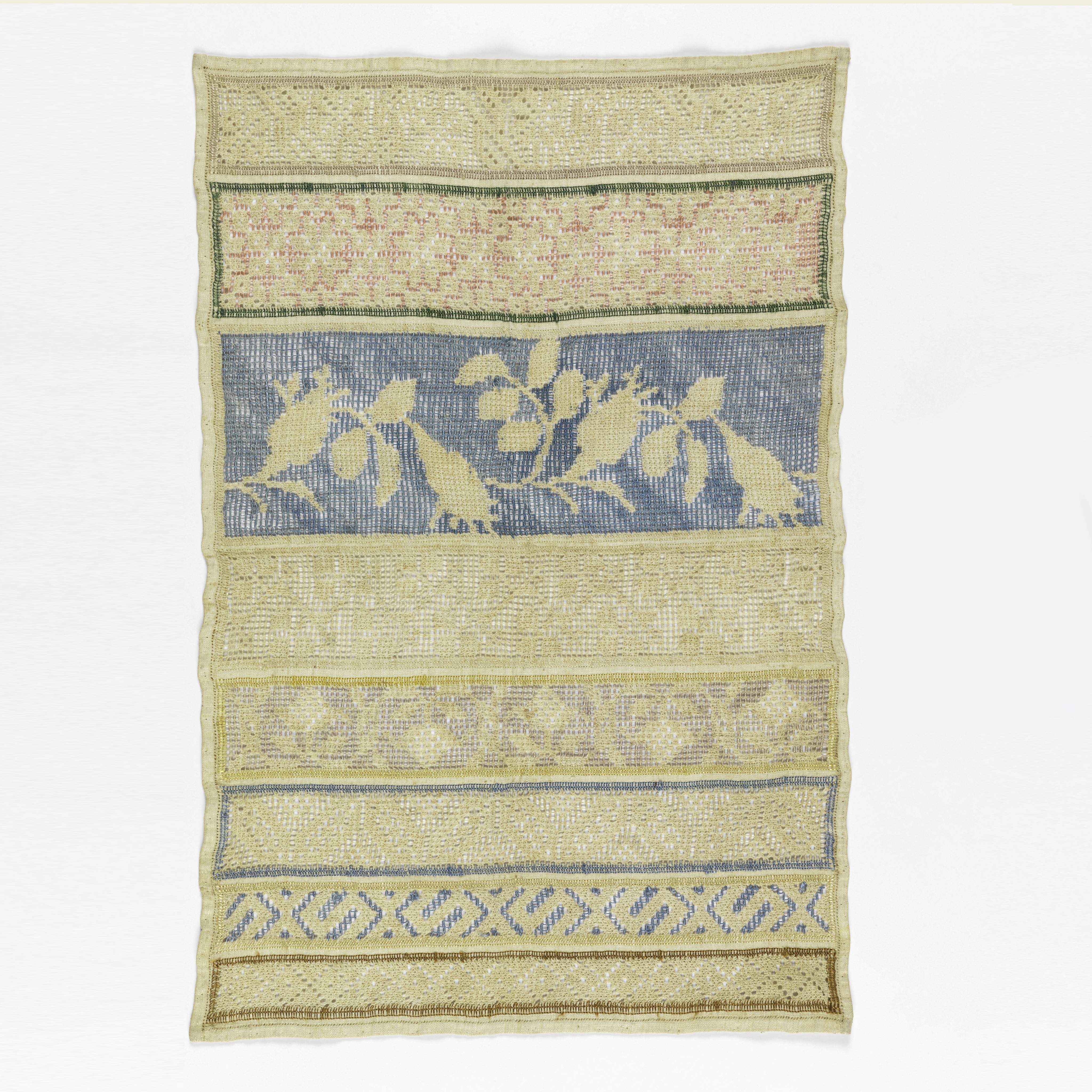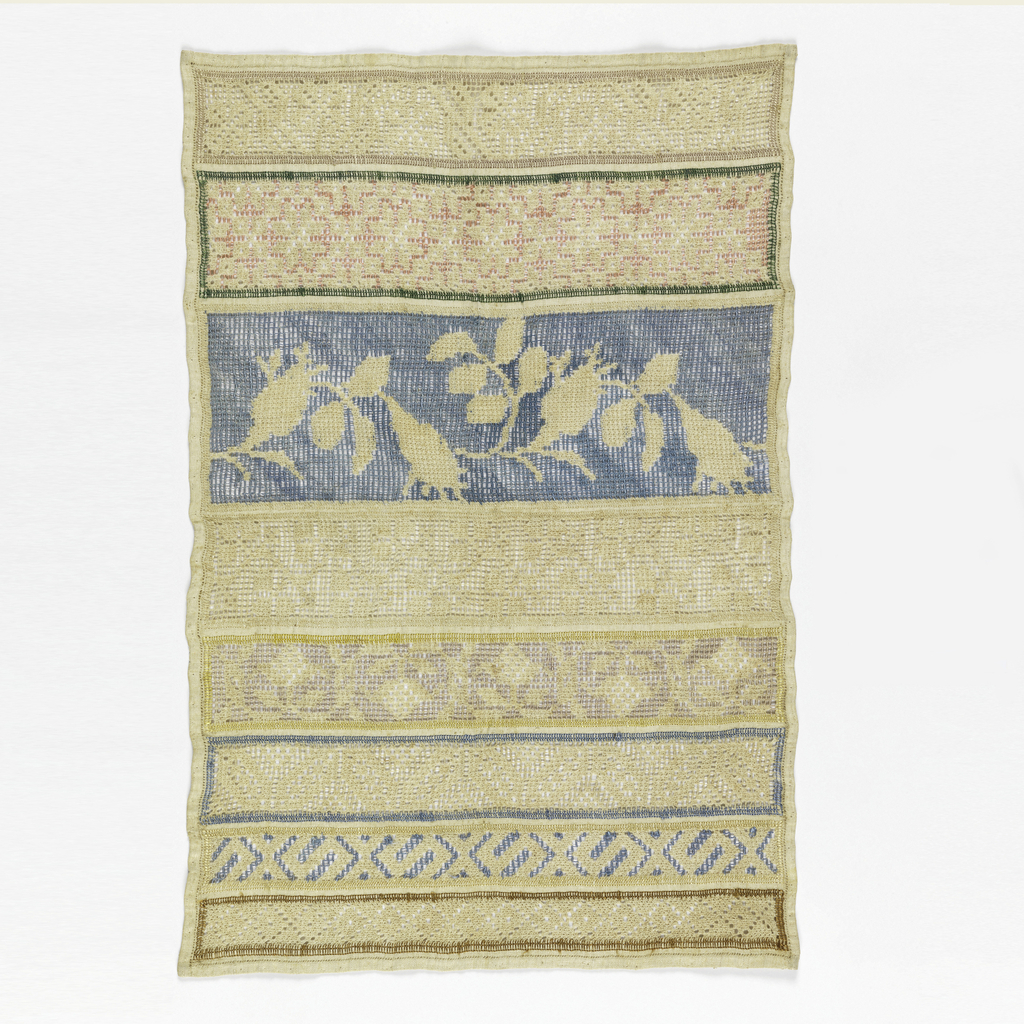 This is a Sampler. It is dated early 19th century and we acquired it in 1941. Its medium is linen and silk embroidery, linen foundation and its technique is overcast bars, loops and darning stitches on plain weave. It is a part of the Textiles department.