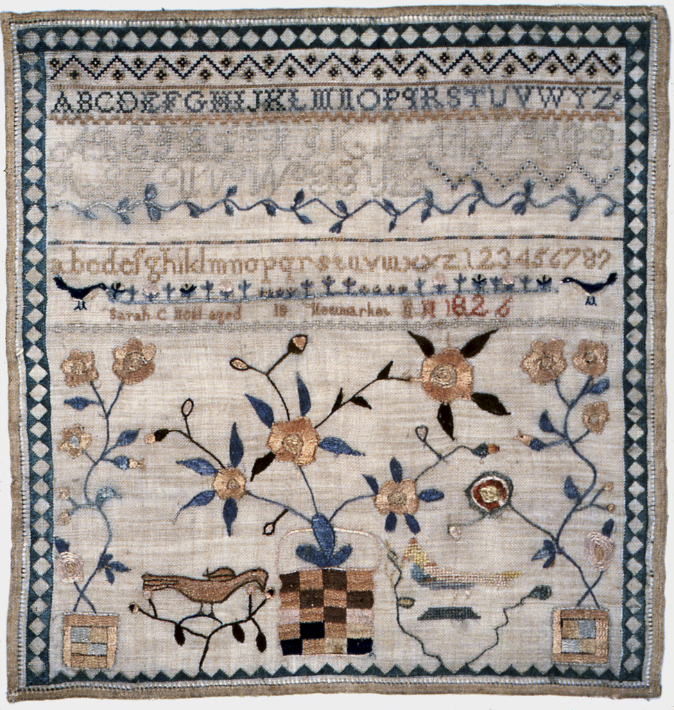 This is a Sampler. It was embroidered by Sarah C. Neal, American. It is dated 1826 and we acquired it in 1941. Its medium is silk embroidery on linen foundation and its technique is embroidered in cross, satin, and stem stitches on plain weave foundation. It is a part of the Textiles department.