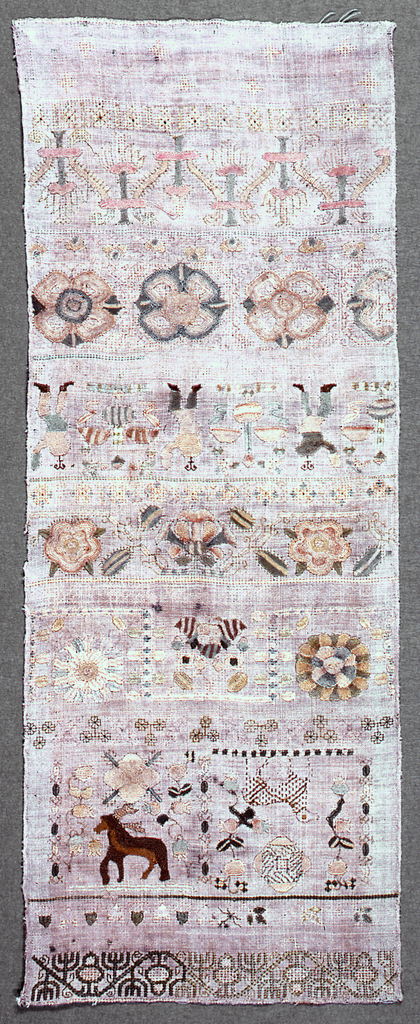This is a Sampler. It is dated 17th century and we acquired it in 1941. Its medium is silk embroidery, linen foundation and its technique is cross, surface, double running, rococo and satin stitches on plain weave. It is a part of the Textiles department.