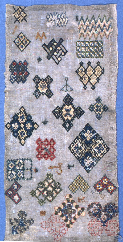 This is a Sampler. It is dated 17th century and we acquired it in 1941. Its medium is silk and metallic thread embroidery, linen foundation and its technique is embroidery. It is a part of the Textiles department.
