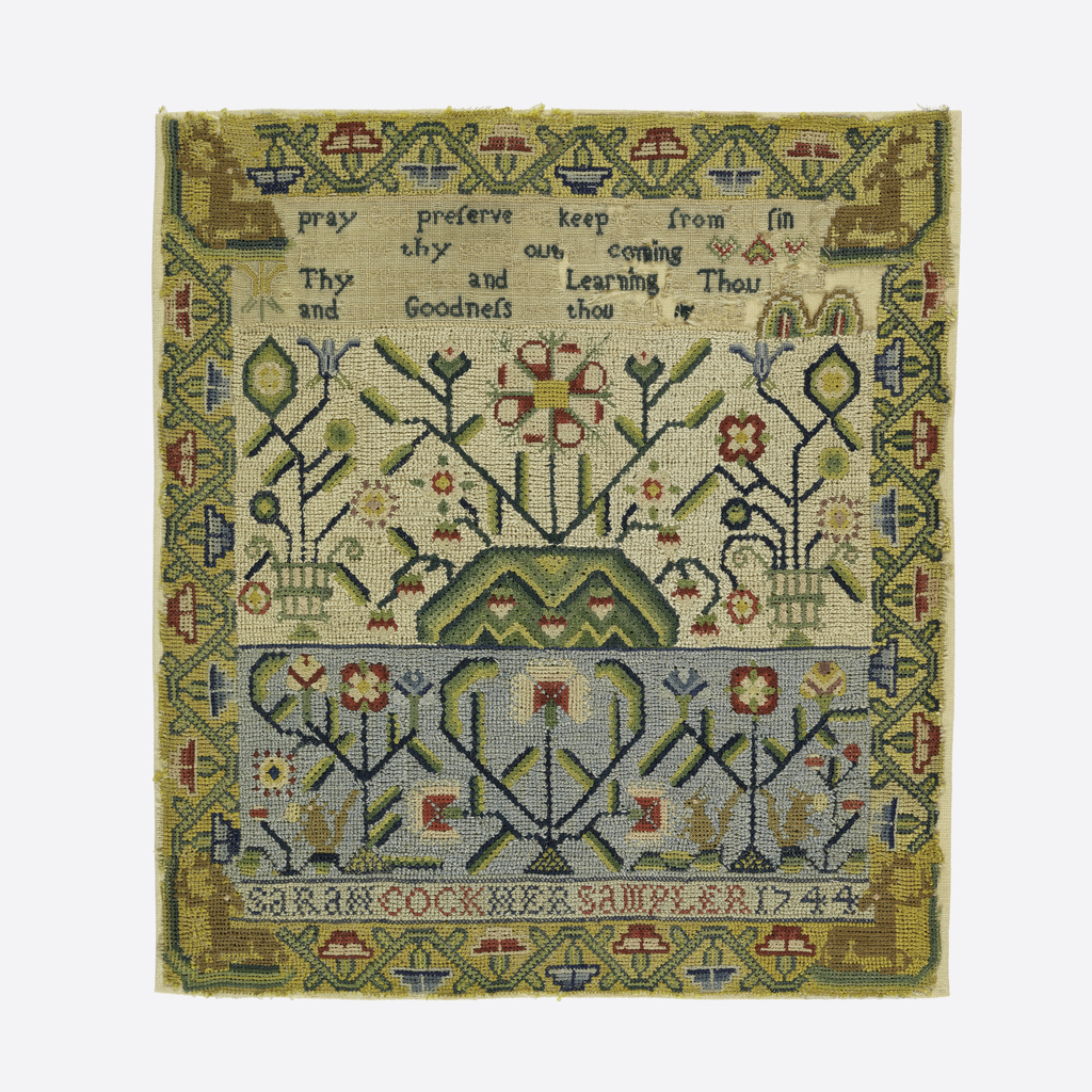 This is a Sampler. It was embroidered by Sarah Cook. It is dated 1744 and we acquired it in 1941. Its medium is silk embroidery on wool and its technique is embroidery on plain weave. It is a part of the Textiles department.