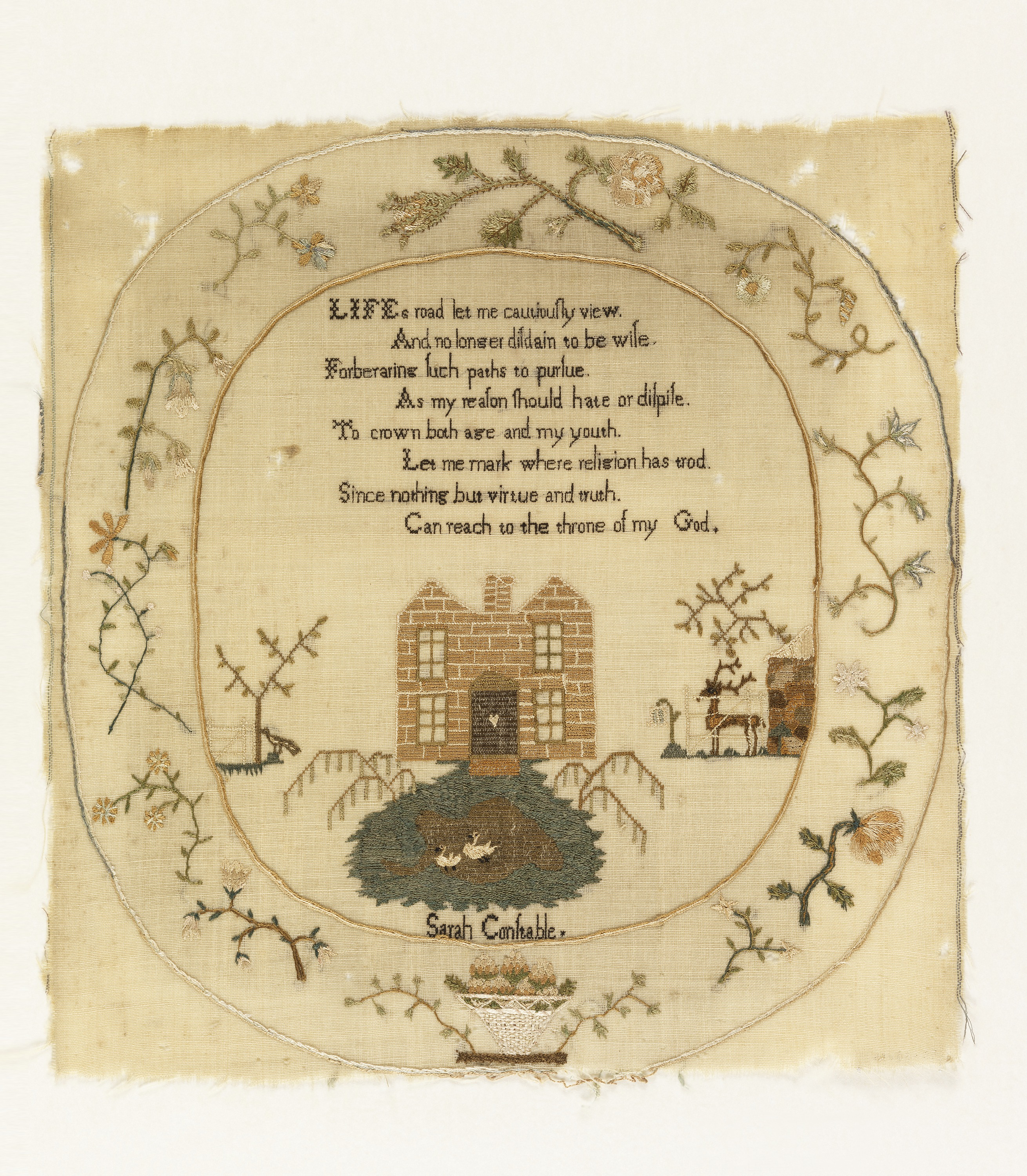 This is a Sampler. It was embroidered by Sarah Constable. It is dated ca. 1815 and we acquired it in 1941. Its medium is silk embroidery, wool foundation and its technique is embroidered in tent, satin, stem, darning and rococo stitches on plain weave. It is a part of the Textiles department.