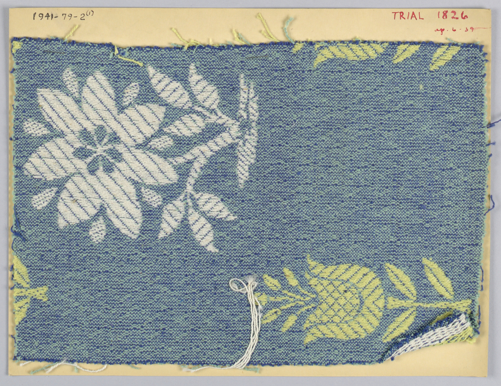 This is a Samples. It is dated 1936–40 and we acquired it in 1941. Its medium is cotton, rayon and its technique is jacquard woven. It is a part of the Textiles department.