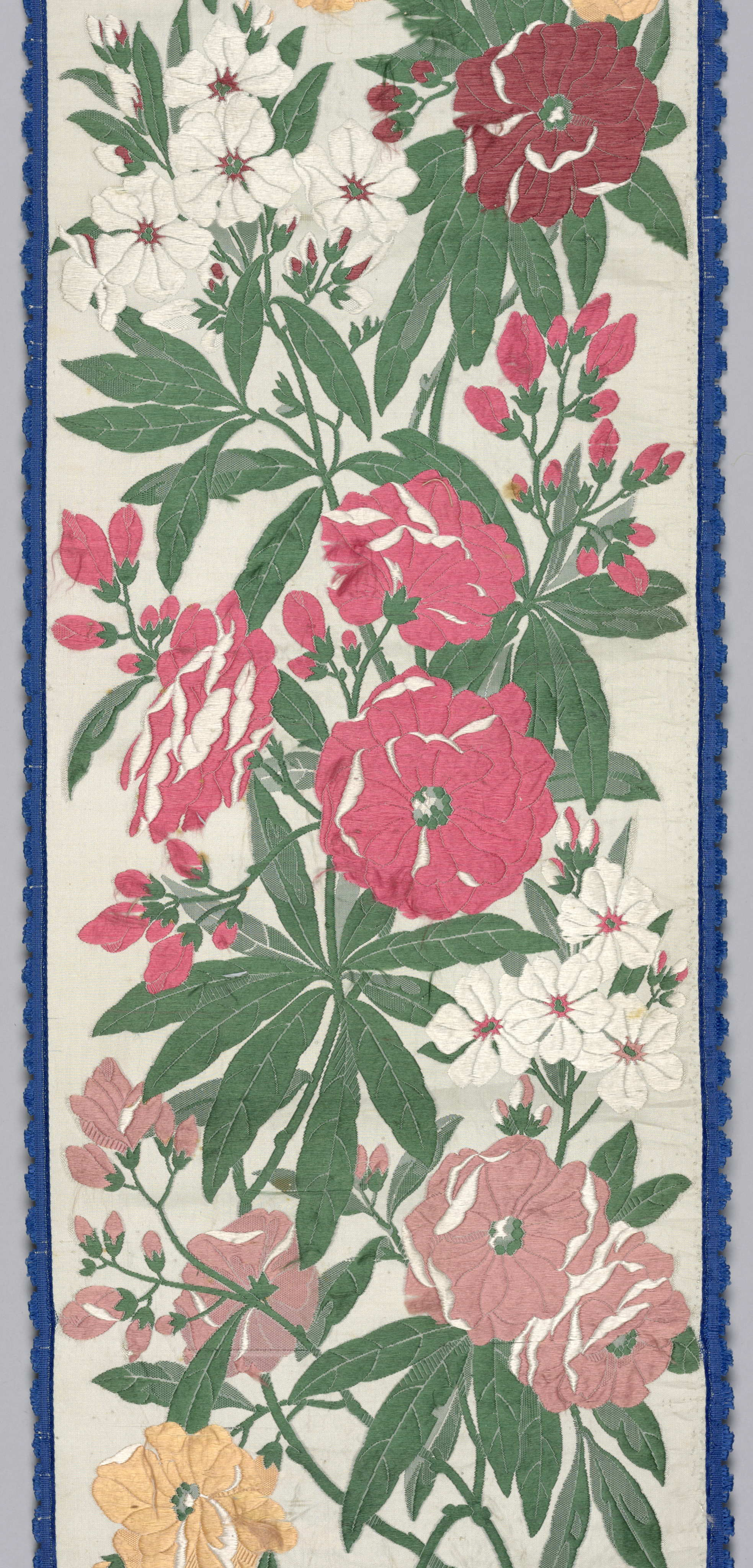 This is a Ribbon. It is dated 1850–99 and we acquired it in 1942. Its medium is cotton, silk. It is a part of the Textiles department.