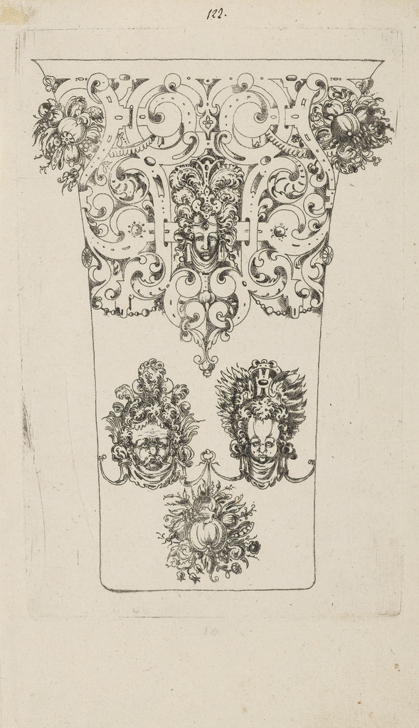 Zan apprenticed as a goldsmith, and his training may have contributed to this relatively restrained series of designs for metalwork cups, which feature layered strapwork as a defining decorative feature, coupled with fruit, plants, and inventive grotesque heads. Zan may have been the first engraver to use the technique of punch-engraving to produce prints.