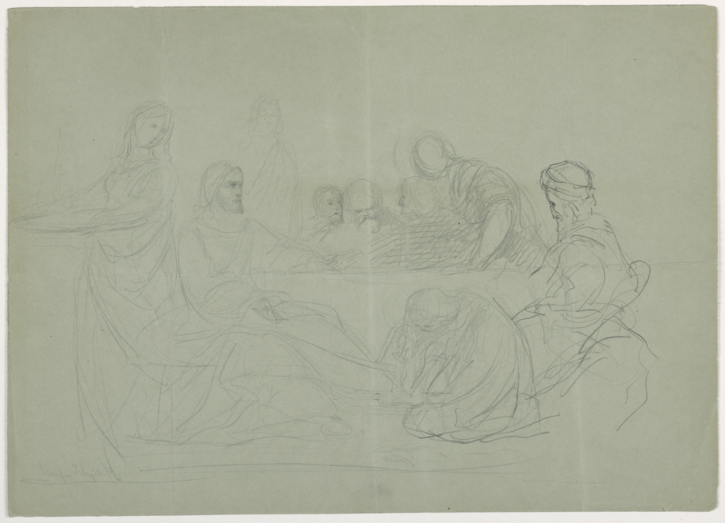 Drawing, Mary Washing the Feet of Christ; Daniel Huntington (American, 1816–1906); USA; graphite on light green paper; 25.4 × 35.4 cm (10 × 13 15/16 in.); Bequest of Erskine Hewitt; 1942-50-437