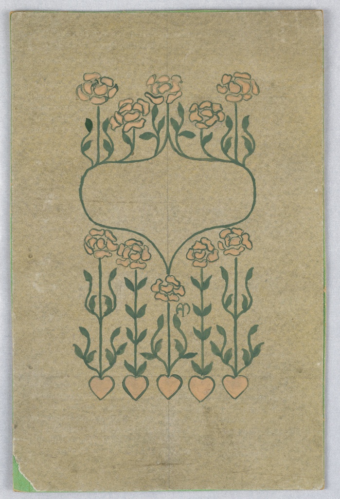 Drawing, Design for a Book Cover; Designed by Alice Cordelia Morse (American, 1863–1961); USA; brush and gouache on paper; Mount: 19.4 x 12.6 x 0.2 cm (7 5/8 x 4 15/16 x 1/16 in.); 1943-33-1-11