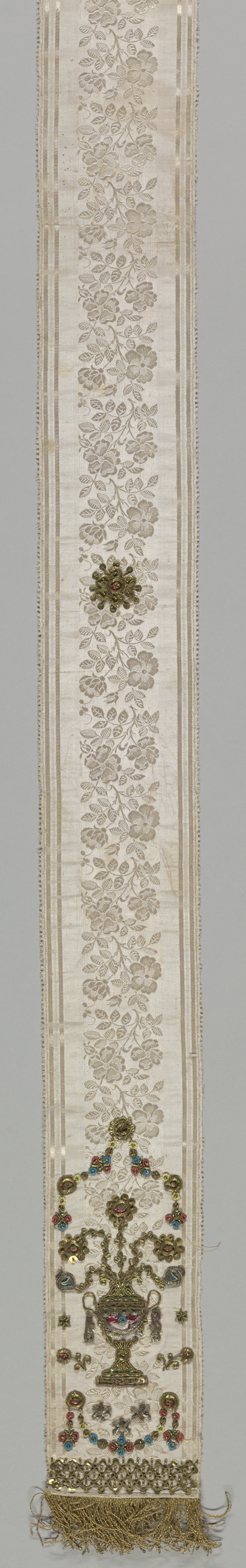This is a Stole. It is dated 19th century and we acquired it in 1943. Its medium is silk ribbons, glass beads, metal thread, and paillettes and its technique is embroidered. It is a part of the Textiles department.