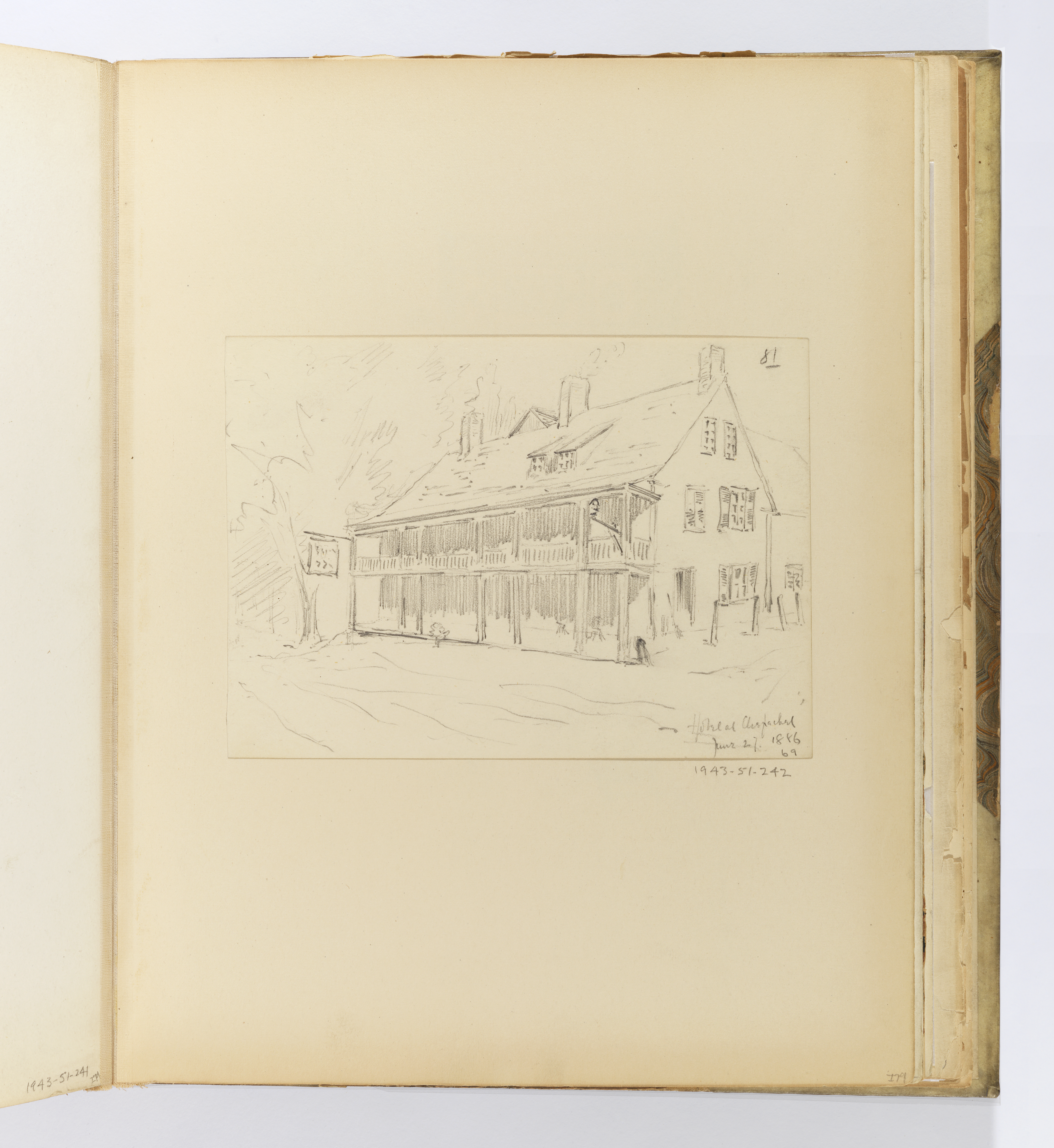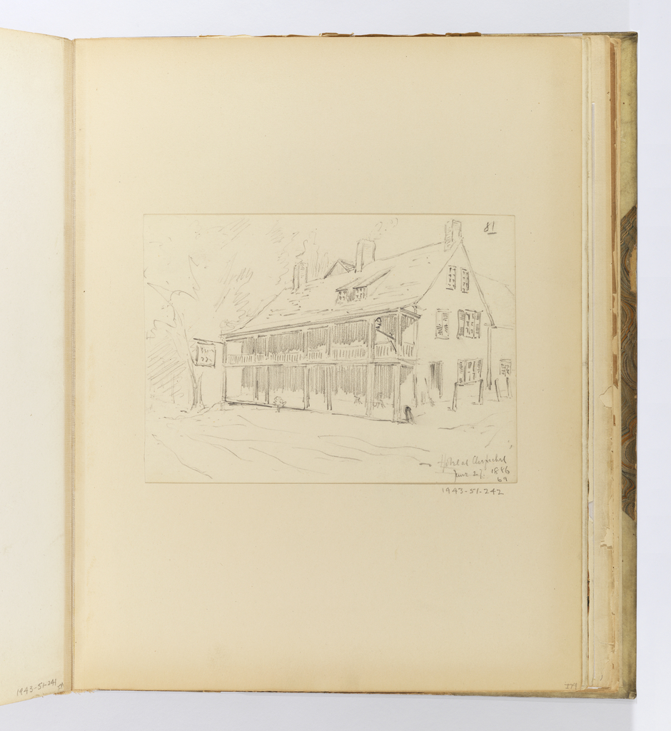 Recto, in graphite, upper right corner (of sheet): 81; lower right corner: Hotel at ...fachel / June 27 1886 / 69; on mount, below right of drawing: 1943-51-242.