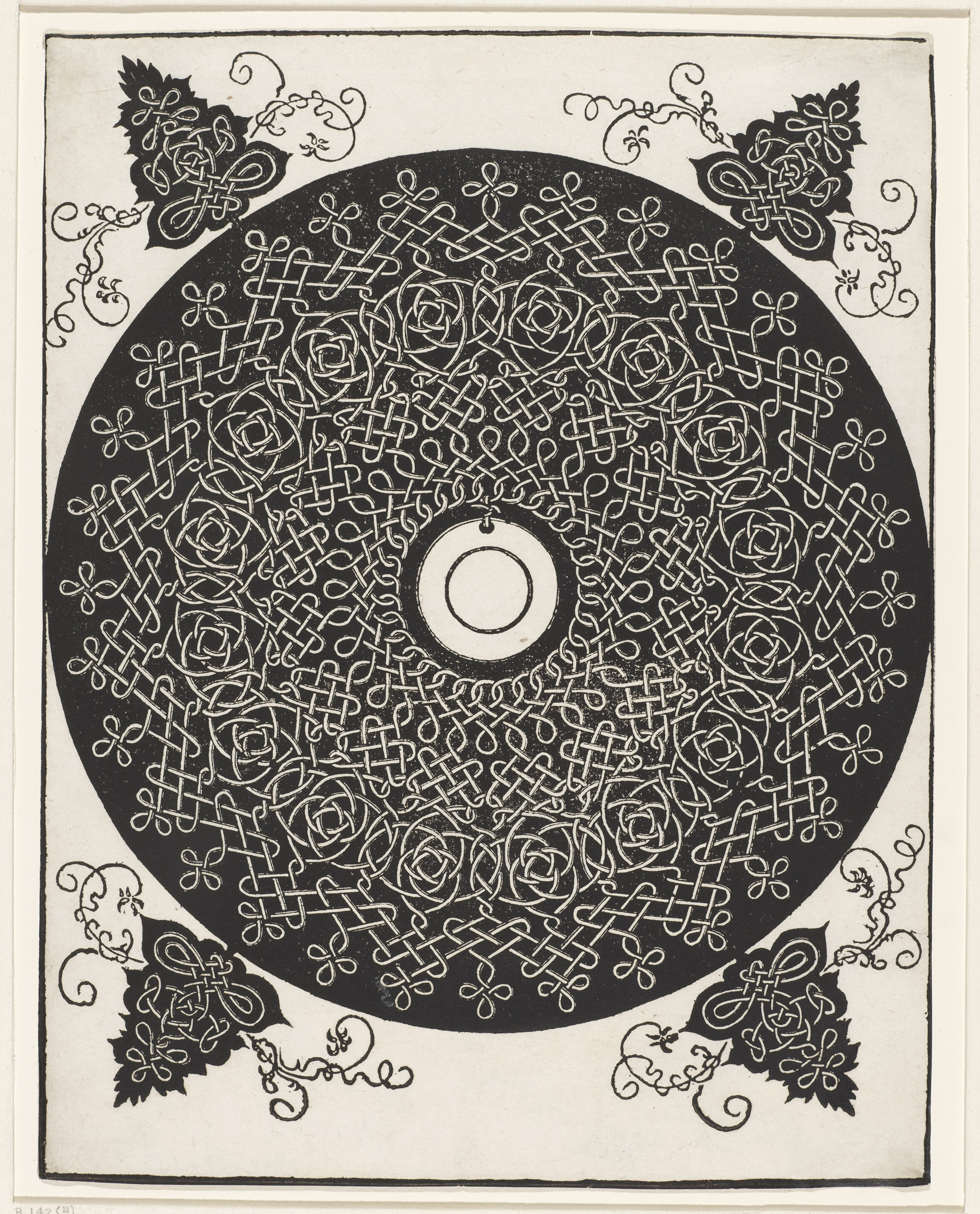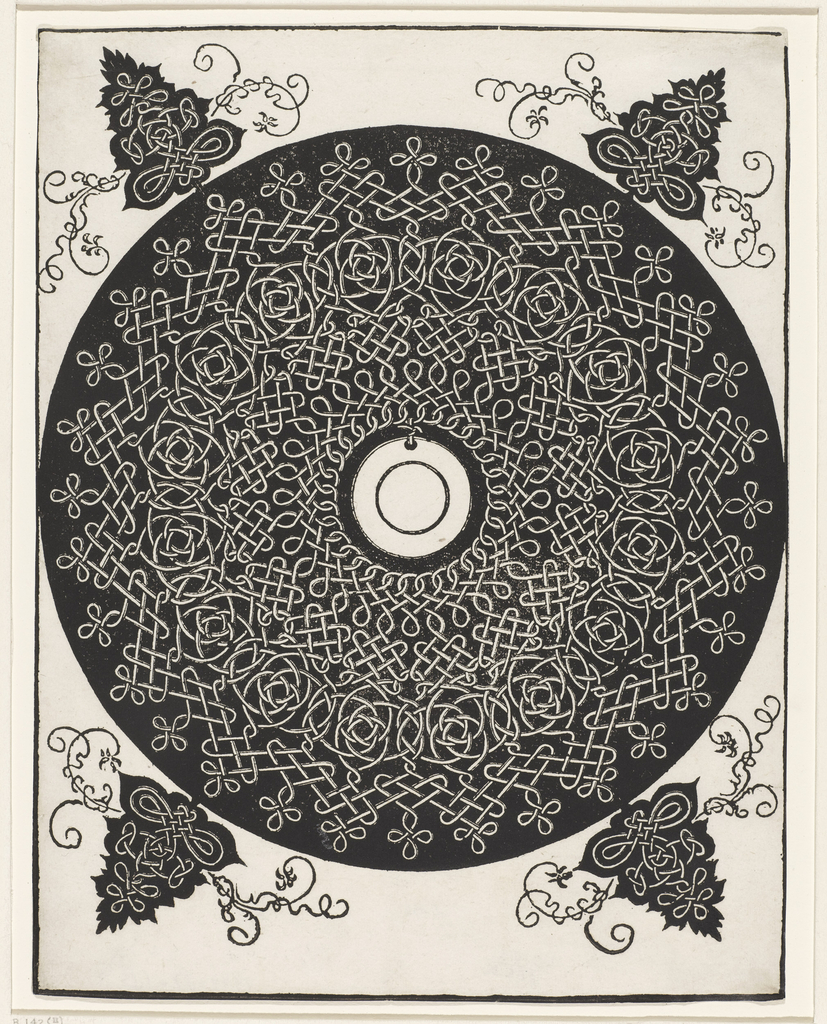 The intended purpose of this enigmatic interlaced design, one of six similar motifs produced by Albrecht Dürer after designs by Leonardo da Vinci, is unknown. It may have served as a pattern for embroidery or textiles, or as a demonstration of the artist’s craftsmanship.