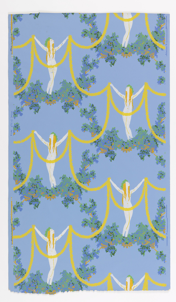 The lone female figure standing in contrapposto alludes to antique statuary, while the draped garlands and the delicate balancing of the figure on the floral swag draw from eighteenth-century neoclassical wallpapers. The fresh colors and minimal nature of the design speaks to the 1920s.