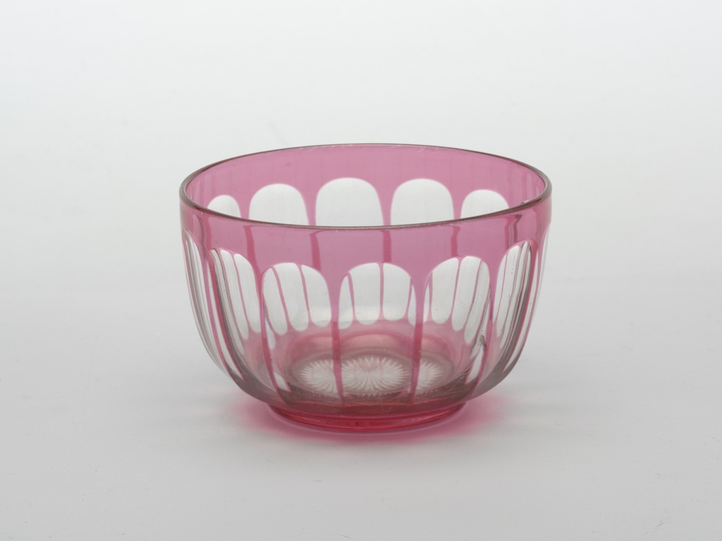 This is a Bowl. It is dated late 19th century and we acquired it in 1945. Its medium is rose overlay glass, cut decoration. It is a part of the Product Design and Decorative Arts department.