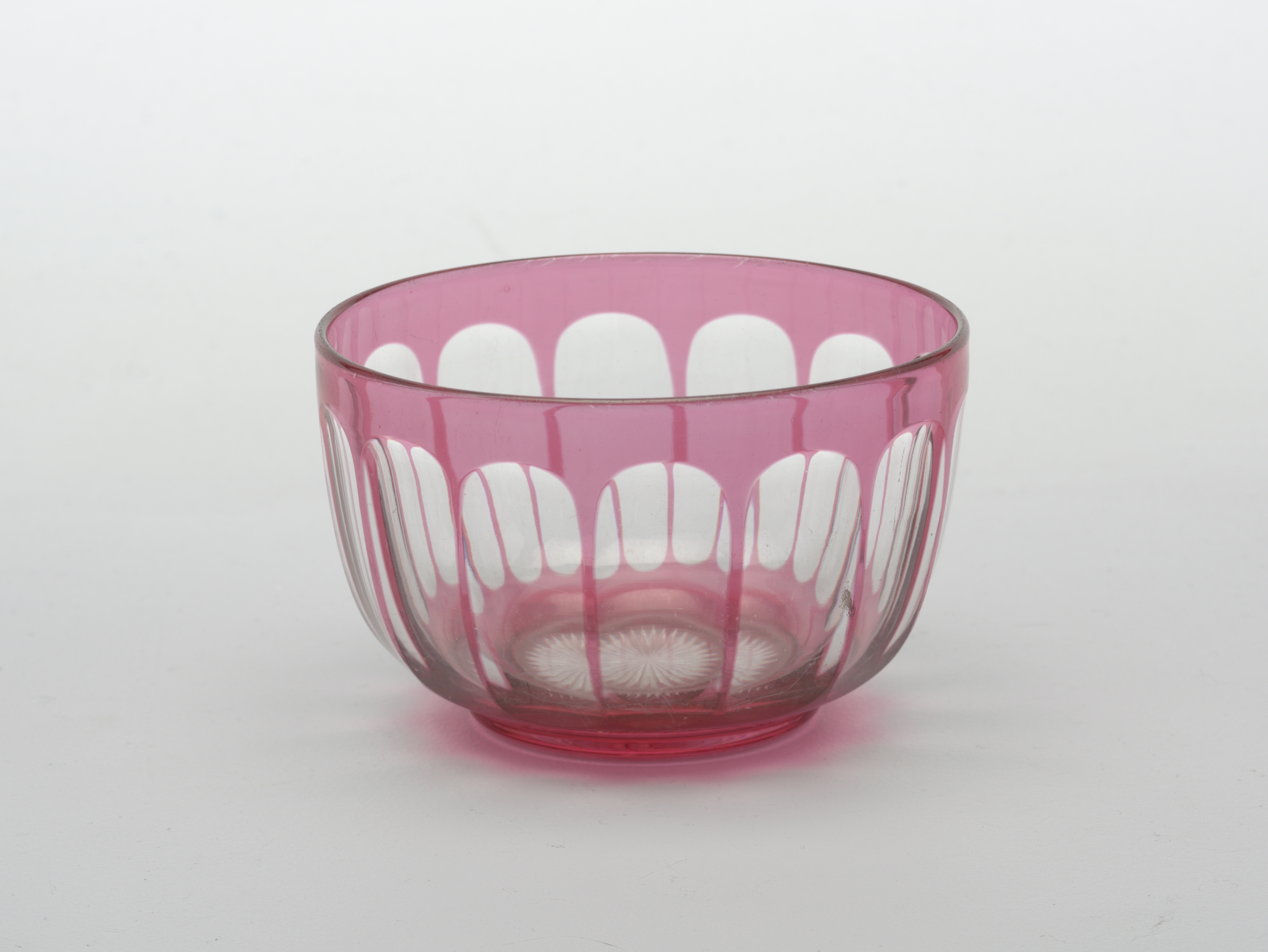 Bowl; rose overlay glass, cut decoration; H x diam.: 7.3 x 11.6 cm (2 7/8 x 4 9/16 in.); Gift of Mrs. Edward C. Moën; 1945-34-16