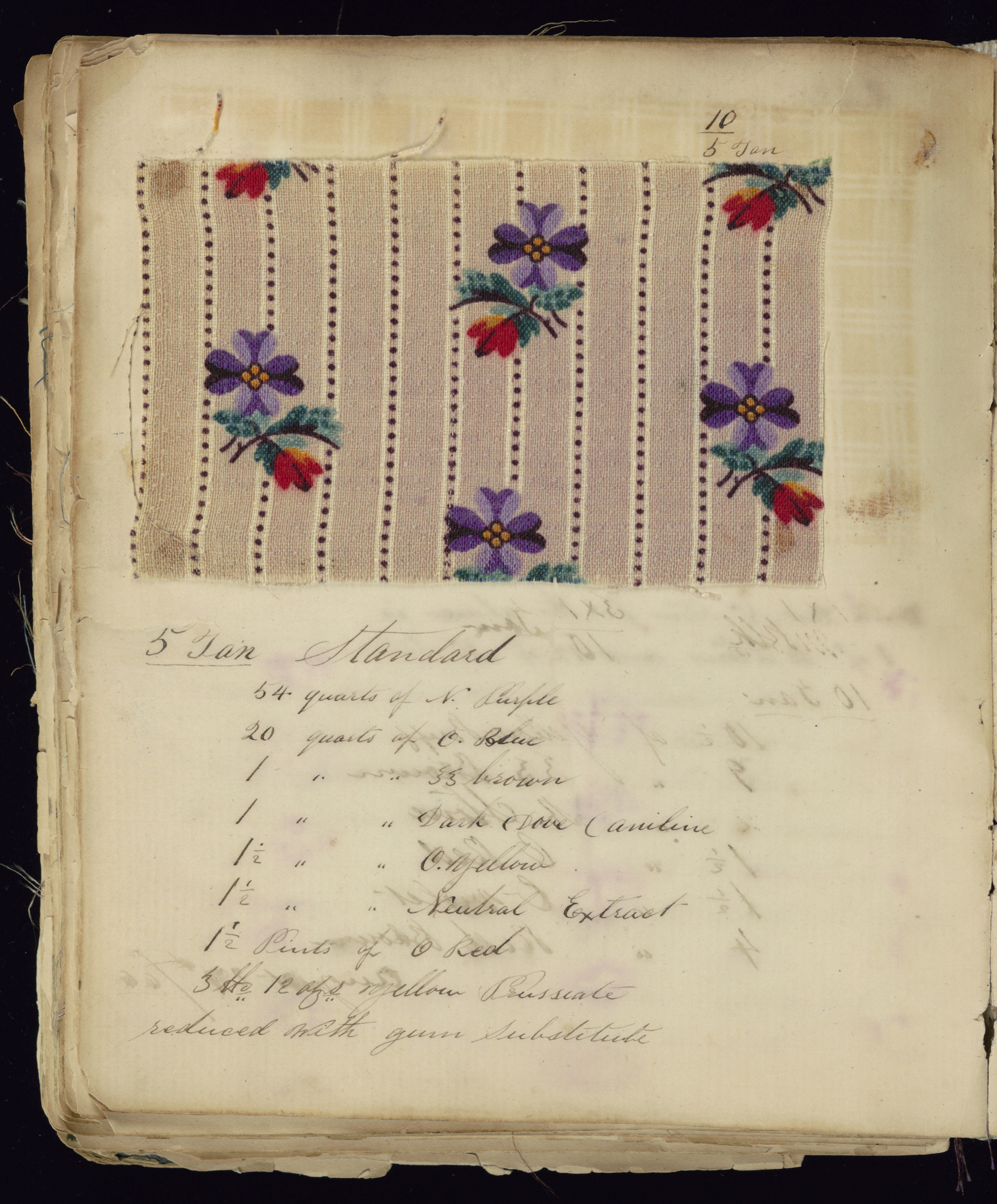 This is a Dyer's record book. It was company: Old Pacific Print Works. It is dated 1861–74 and we acquired it in 1945. Its medium is label: board covers, pen and ink on paper pages, cotton samples. It is a part of the Textiles department.