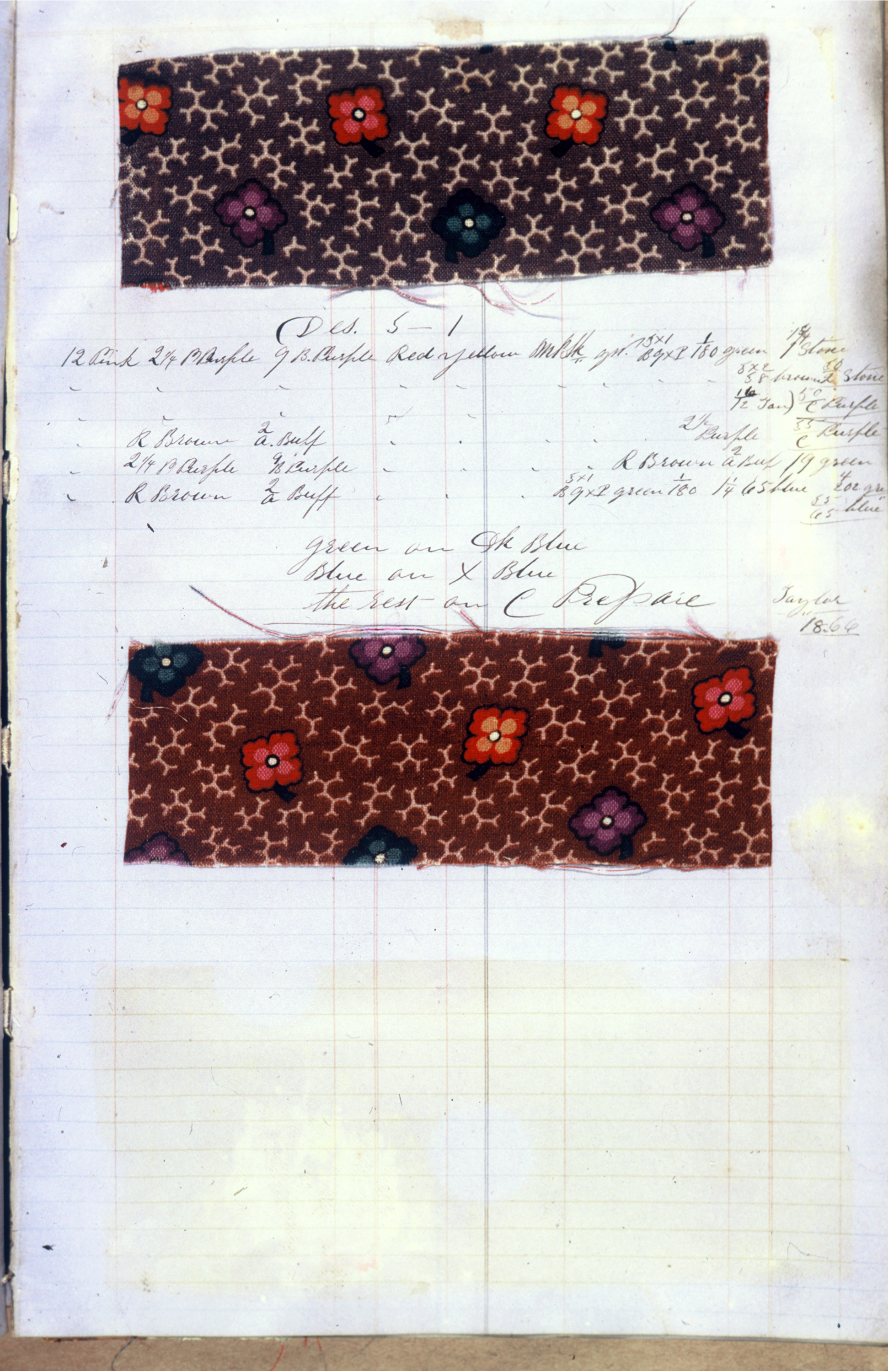 This is a Dyer's record book. It was manufactured by Old Pacific Print Works. It is dated 1862–65 and we acquired it in 1945. Its medium is paper, cotton, wool. It is a part of the Textiles department.