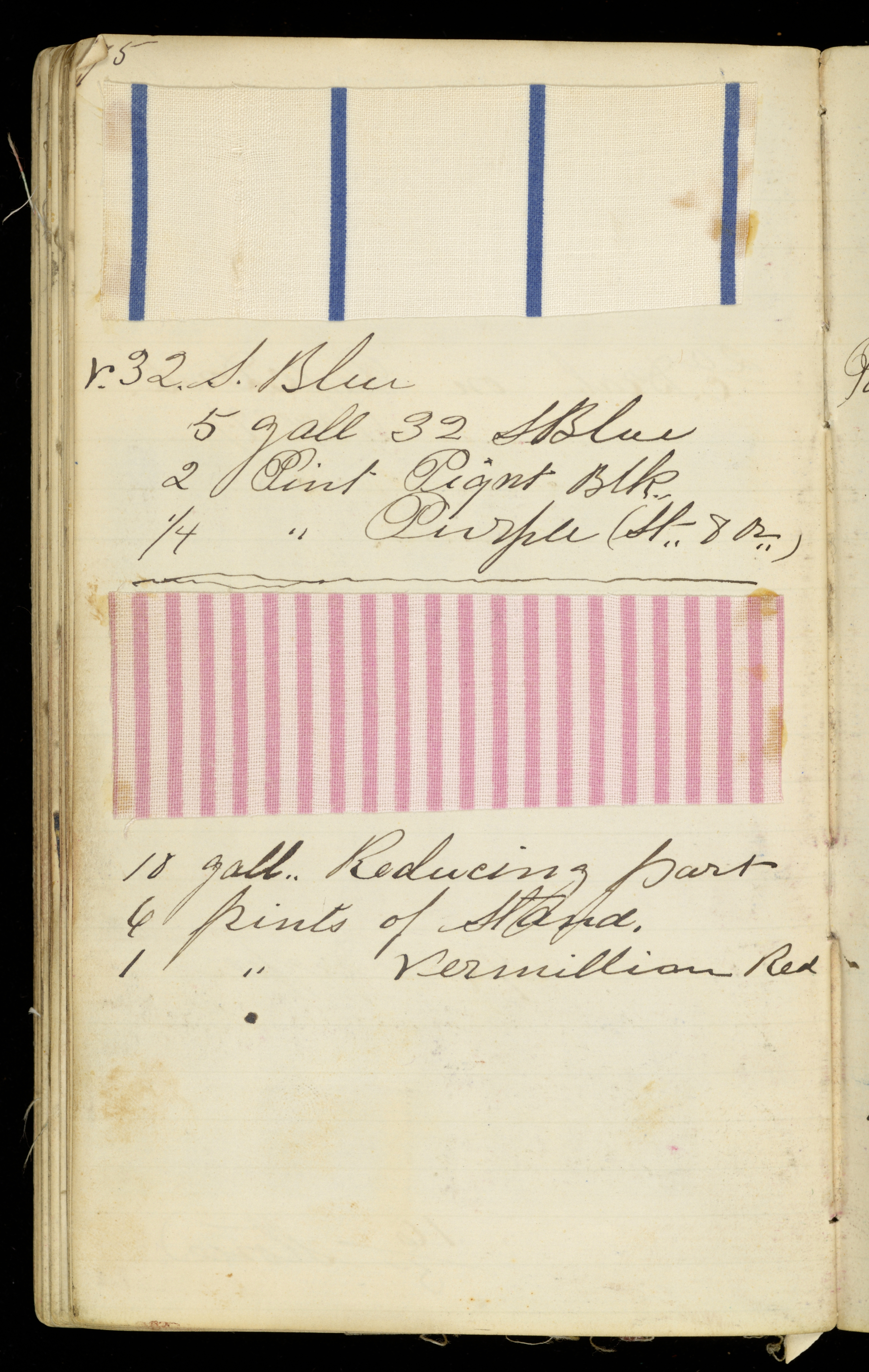 These samples show different colorways for a printed textile probably used as a dress fabric. The book contains information about period design as well as color designations developed in the nineteenth century, such as "Chocolate," "Buff," "Stone," "Wine," and "Drab."