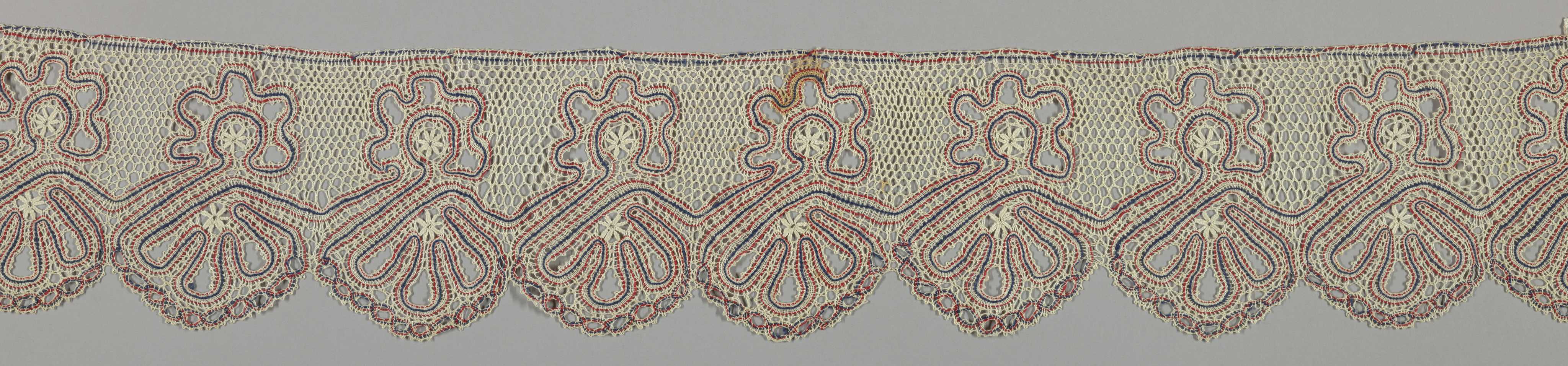 This is a Trimming. It is dated 19th century and we acquired it in 1945. Its medium is linen, silk and its technique is bobbin lace, eastern european, peasant style. It is a part of the Textiles department.