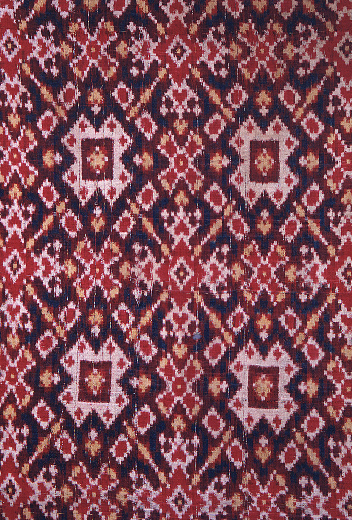 This is a Patola. It is dated 19th century and we acquired it in 1946. Its medium is silk and its technique is tied resist in warp and weft (double ikat). It is a part of the Textiles department.