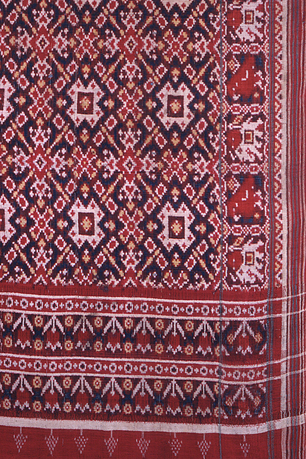 Acquired in 1946, this well-worn patola or double ikat textile, has a central field pattern known as Ratan Chowk Bhat or jewel mosaic. A border of elephants and parrots flank the side, while a double row of tulip flowers sprout at one end, with an arrowhead motif in single warp ikat at the palluv edge. Telltale signs of wear, cut edges, and hand stitched borders suggest the variety of incarnations this patola must have lived. It likely made its first public appearance at a Gujarati wedding. The mother of the groom may have worn it draped as a sari or it may have been given as a gift to the bridal couple. After much use, the owners stitched a red border to the treasured textile, perhaps to use it as a decorative furnishing in the home.
