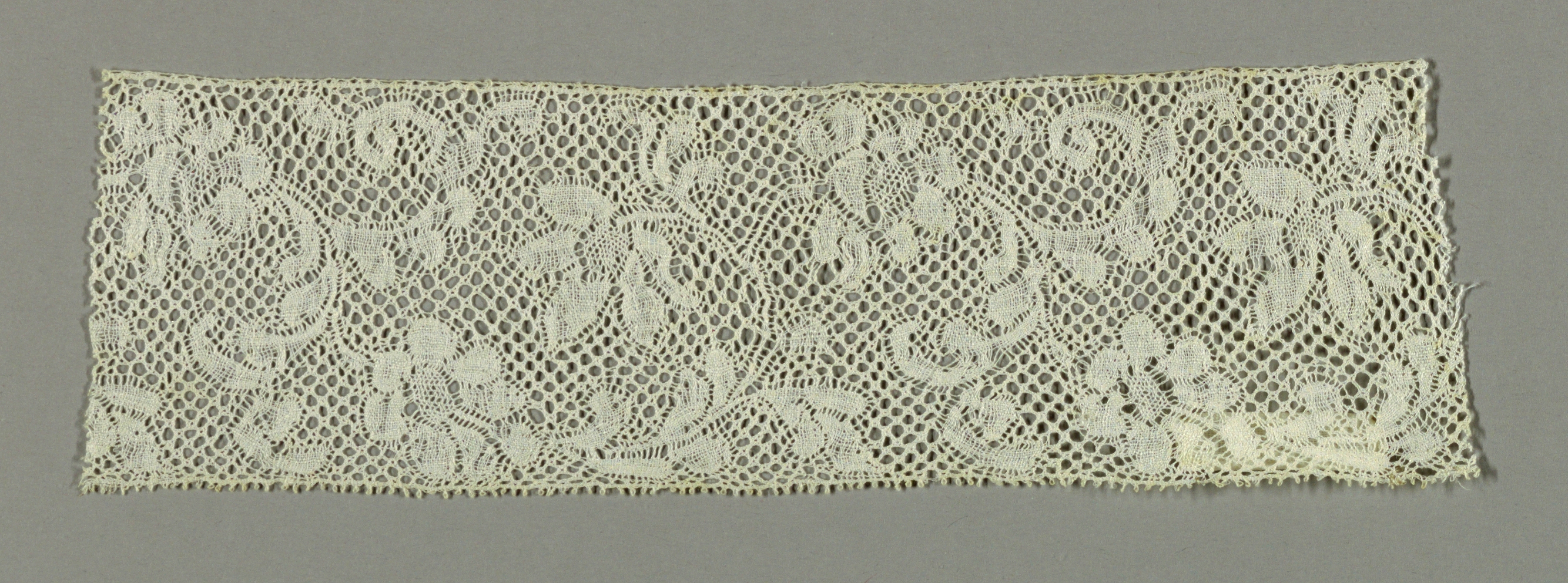 This is a Fragment. It is dated 18th century and we acquired it in 1946. Its medium is linen and its technique is bobbin lace, binche style with binche ground. It is a part of the Textiles department.