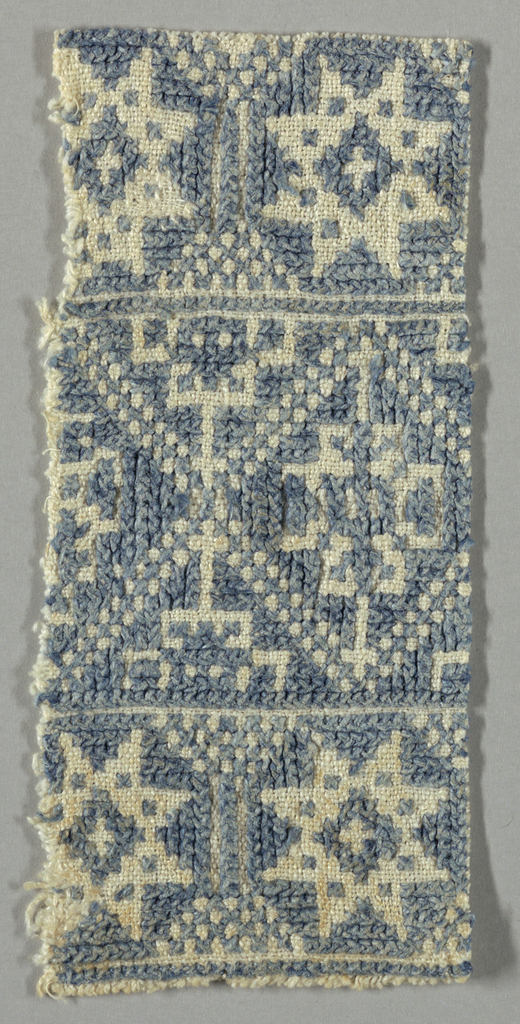 This is a Textile. It is dated 19th century and we acquired it in 1946. Its medium is cotton embroidery on cotton foundation and its technique is embroidered in cross stitch on plain weave. It is a part of the Textiles department.