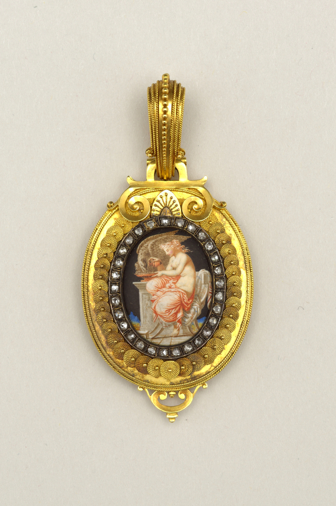This is a Locket. It is dated mid-19th century and we acquired it in 1946. Its medium is gold, opaque enamel, rose diamonds. It is a part of the Product Design and Decorative Arts department.