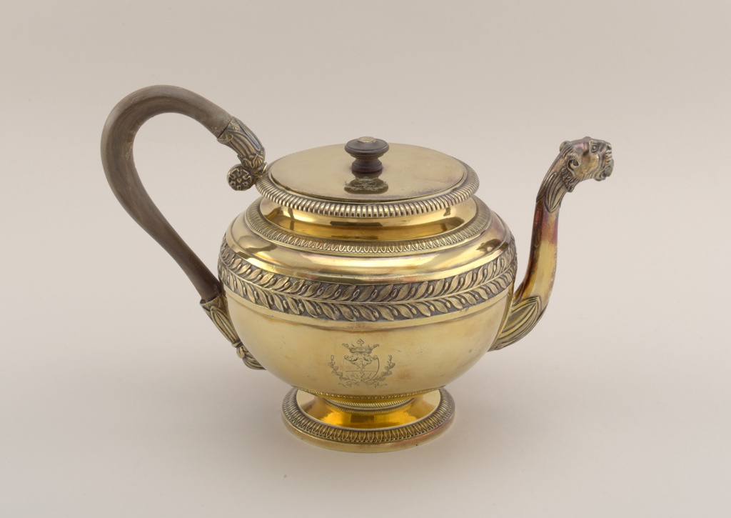 Teapot with Lion Head Spout Teapot; Made by Jean-Baptiste-Claude Odiot (French, 1763 - 1850), Charles Nicolas Odiot (French, 1789 - 1869); France; silver, gold, wood; H x W x D: 17.5 × 25.6 × 13.3 cm (6 7/8 × 10 1/16 × 5 1/4 in.); Gift of James Hazen Hyde; 1946-76-1-a,b