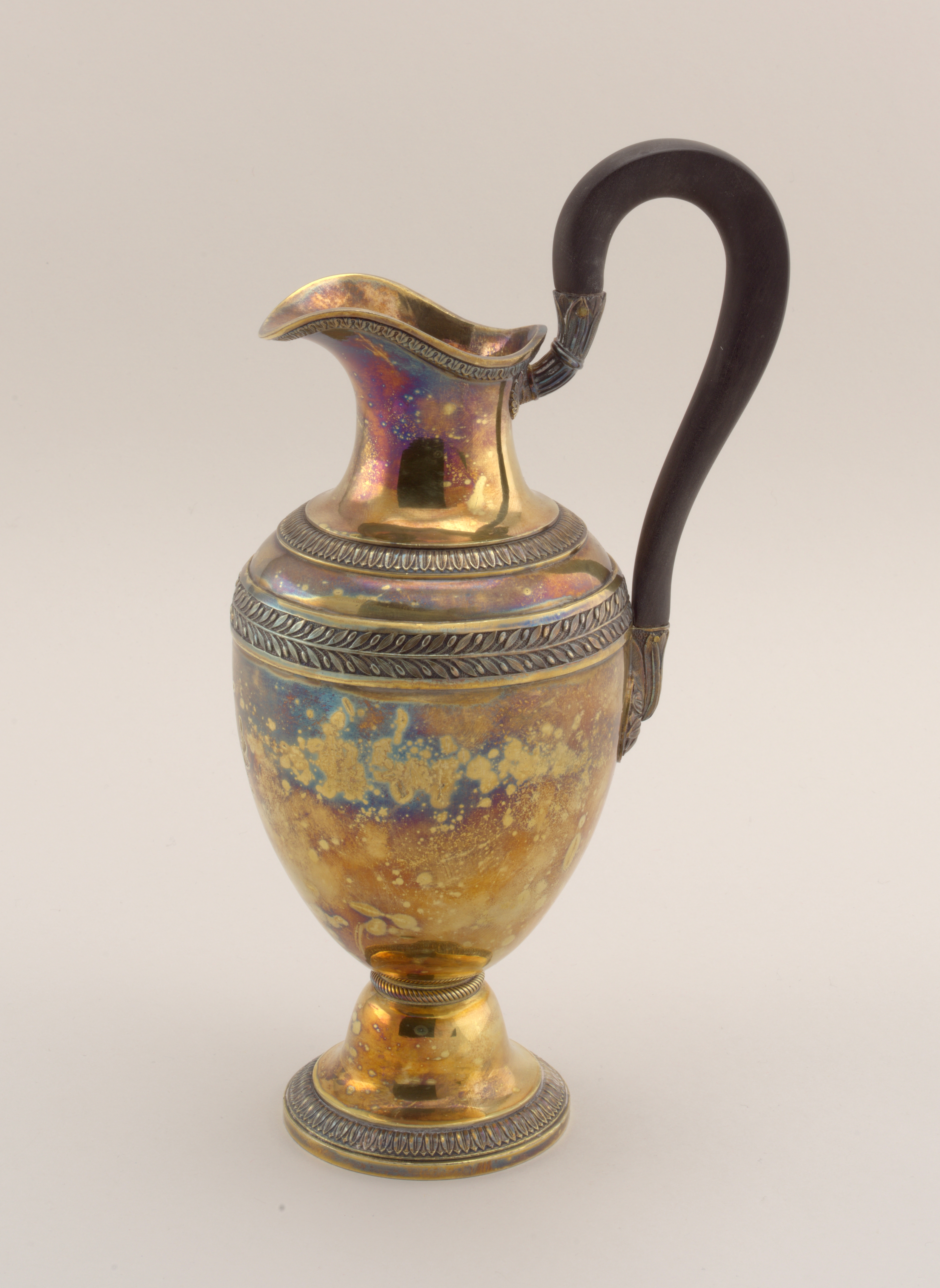 On the underside of jug: [1] “O” above a lamp within a lozenge, impressed (maker’s mark) On the base edge of jug: [1] “ODIOT.”, impressed (maker’s mark) [2] Cérès head in circle, impressed (guarantee mark, French, 1819–1838) On the neck of jug, near the handle: [1] Michelangelo head facing right with “1” in an octagon, impressed (standard mark, French, 1819–1838)