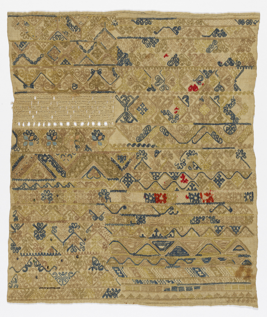 Sampler (Spain); linen, silk and wool embroidery with glass beads on linen foundation; H x W: 58 x 47 cm (22 13/16 x 18 1/2 in.); Gift of Mrs. Henry J. Bernheim; 1947-47-19