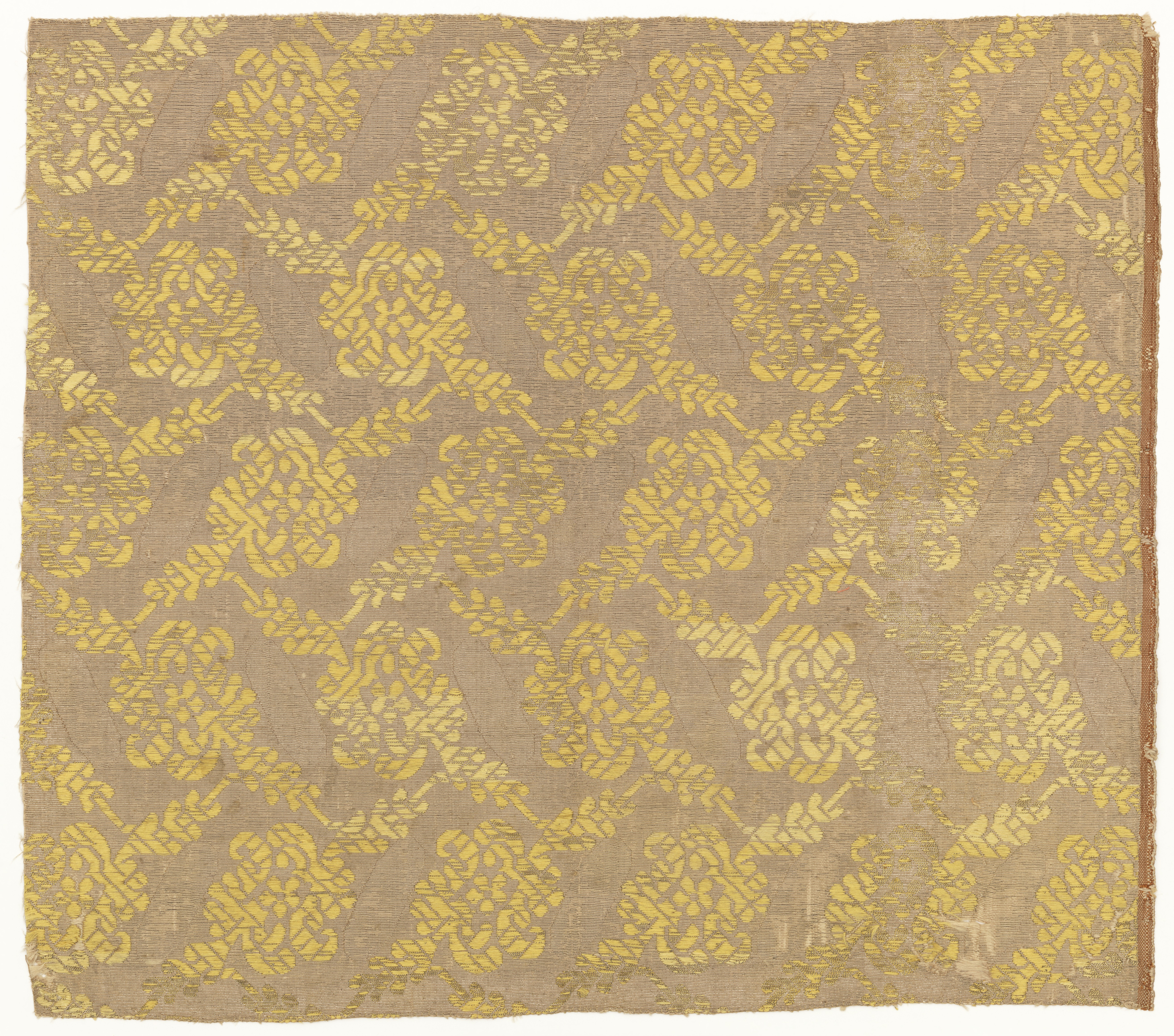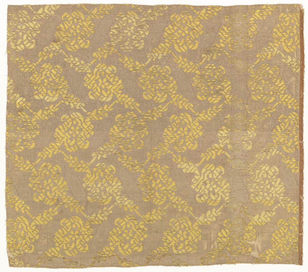 This is a Textile. It is dated 17th–mid- 18th century and we acquired it in 1947. Its medium is silk, metallic yarns and its technique is plain weave with discontinuous supplementary weft patterning (brocade). It is a part of the Textiles department.