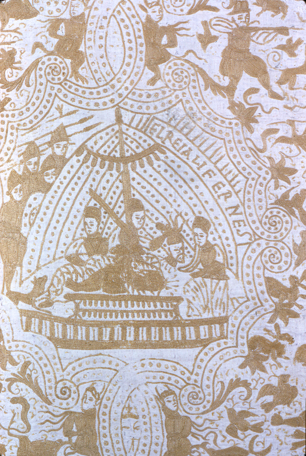 Embroidered in Bengal, India for the Portuguese market, this colcha, or bedcover, is a result of the interchange of goods and cultural influence between two trade markets. The style and materials are typical of India, but the universal theme of good triumphing over evil is illustrated through a mix of local and European imagery. Eight vignettes, framed by intertwined makara (an auspicious sea creature), depict Portuguese and Mughal hunting groups, as well as figures from both Christian and Hindu mythology. Two scenes from the Old Testament story of Judith beheading King Holofernes are detailed in the bottom vignettes. The interstices are filled with Hindu demons, trailing vines, and European hunters in pursuit of animals. This tendency to fill the space mirrors that of Indian temple decoration. The yellow tussah silk used to embroider in kanthe style - with chain stitch and back stitches - is indigenous to the region. This type of embroidery was brought back to Portugal for use in the home, and through trade, became popular in other European countries.