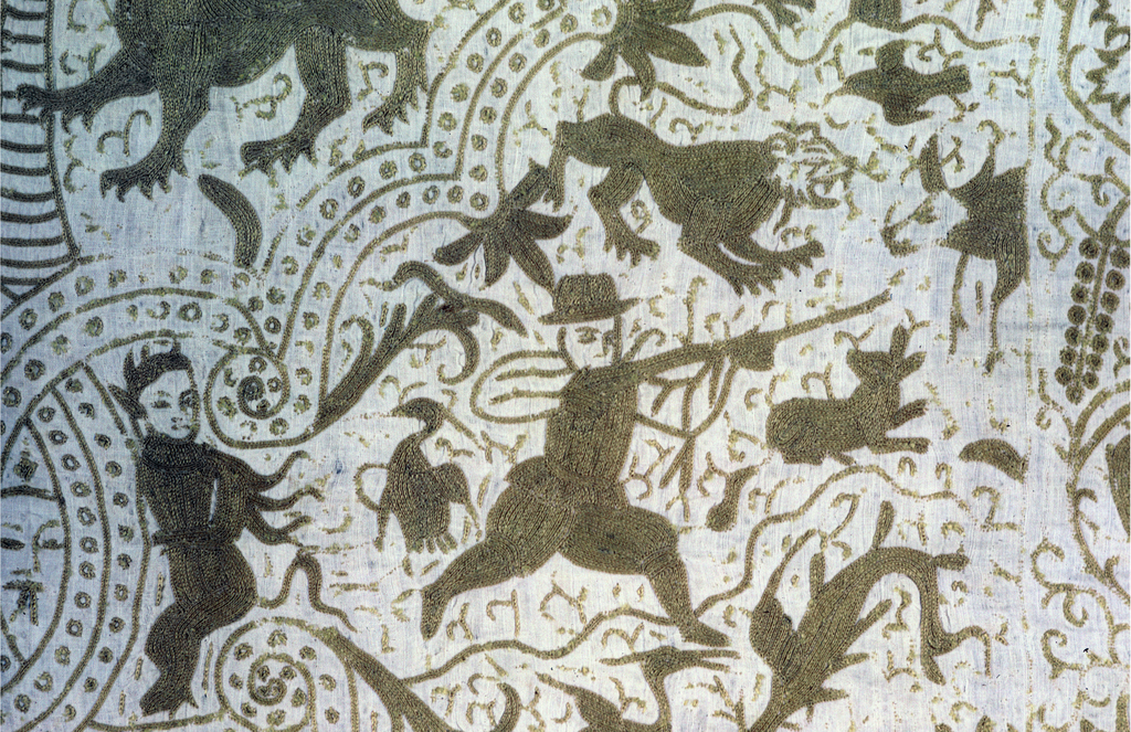 Embroidered in Bengal, India for the Portuguese market, this colcha, or bedcover, is a result of the interchange of goods and cultural influence between two trade markets. The style and materials are typical of India, but the universal theme of good triumphing over evil is illustrated through a mix of local and European imagery. Eight vignettes, framed by intertwined makara (an auspicious sea creature), depict Portuguese and Mughal hunting groups, as well as figures from both Christian and Hindu mythology. Two scenes from the Old Testament story of Judith beheading King Holofernes are detailed in the bottom vignettes. The interstices are filled with Hindu demons, trailing vines, and European hunters in pursuit of animals. This tendency to fill the space mirrors that of Indian temple decoration. The yellow tussah silk used to embroider in kanthe style - with chain stitch and back stitches - is indigenous to the region. This type of embroidery was brought back to Portugal for use in the home, and through trade, became popular in other European countries.