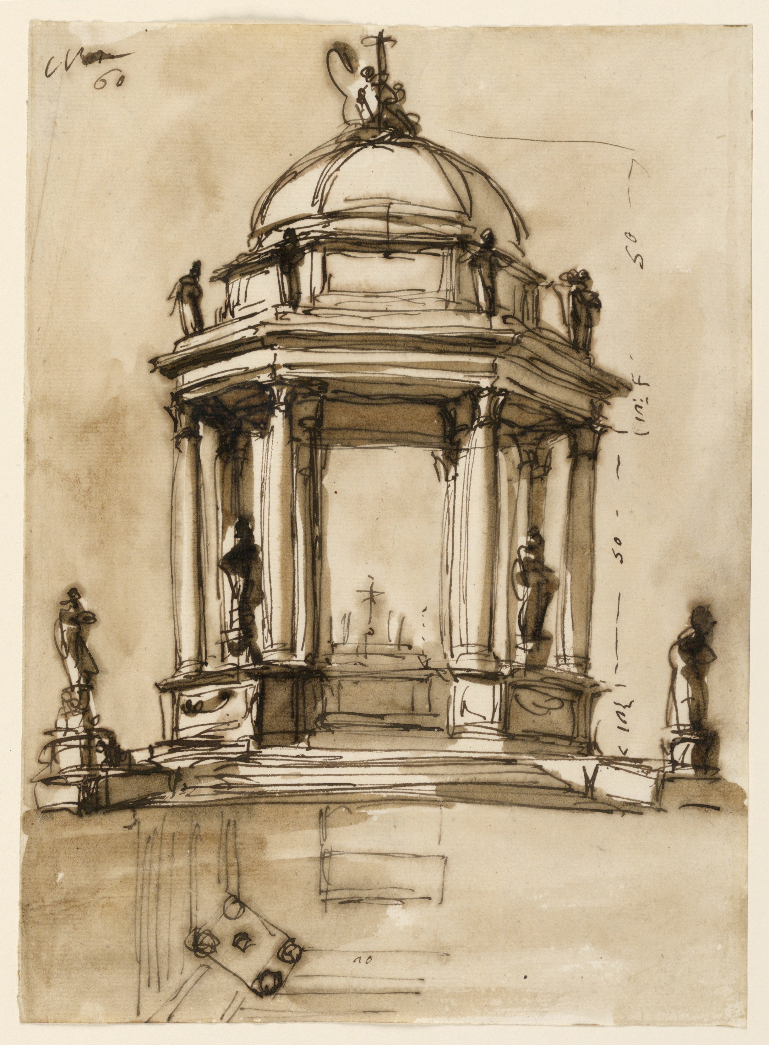 Drawing, Baldachin; Giuseppe Barberi (Italian, 1746–1809); Italy; pen and brown ink, brush and brown wash on paper; Image: 26.9 x 19.5 cm (10 9/16 x 7 11/16 in.); Gift of Janos Scholz; 1947-58-7
