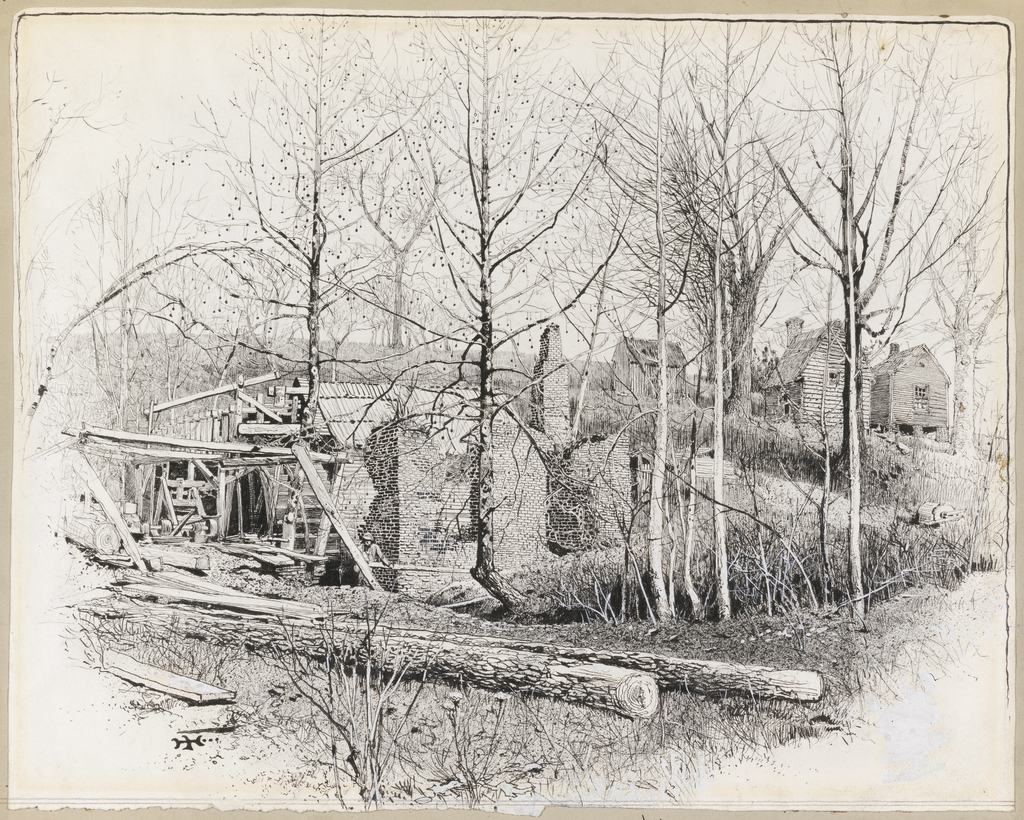 Drawing, Present Aspect of Gaines's Mill, Looking East; Harry Fenn (American, 1845–1911); USA; pen and brush and black ink, white gouache on off-white wove paper pasted on board; 25.7 x 32.4 cm (10 1/8 x 12 3/4 in.), irregular; Gift of Willis M. Rose; 1947-87-17