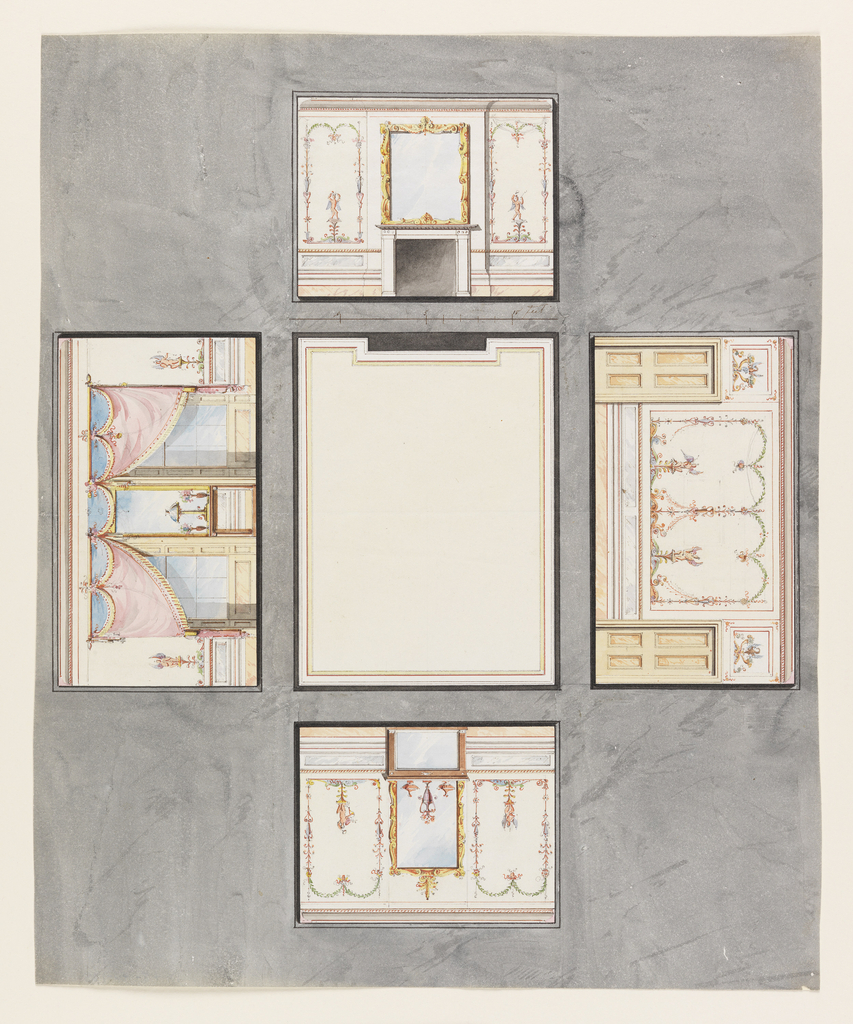 Drawing, Ceiling and Four Walls of a Room; Designed by Frederick Crace (English, 1779–1859); England; graphite, pen and black ink, brush and watercolor on wove paper; 35 x 28.8 cm (13 3/4 x 11 5/16 in.); Museum purchase through gift of Mrs. John Innes Kane; 1948-40-125