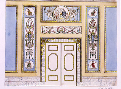 Drawing, Side Wall with Doorway; Designed by Frederick Crace (English, 1779–1859); England; pen and black ink and watercolors on wove paper; 17.5 x 22.5 cm (6 7/8 x 8 7/8 in.); Museum purchase through gift of Mrs. John Innes Kane; 1948-40-134