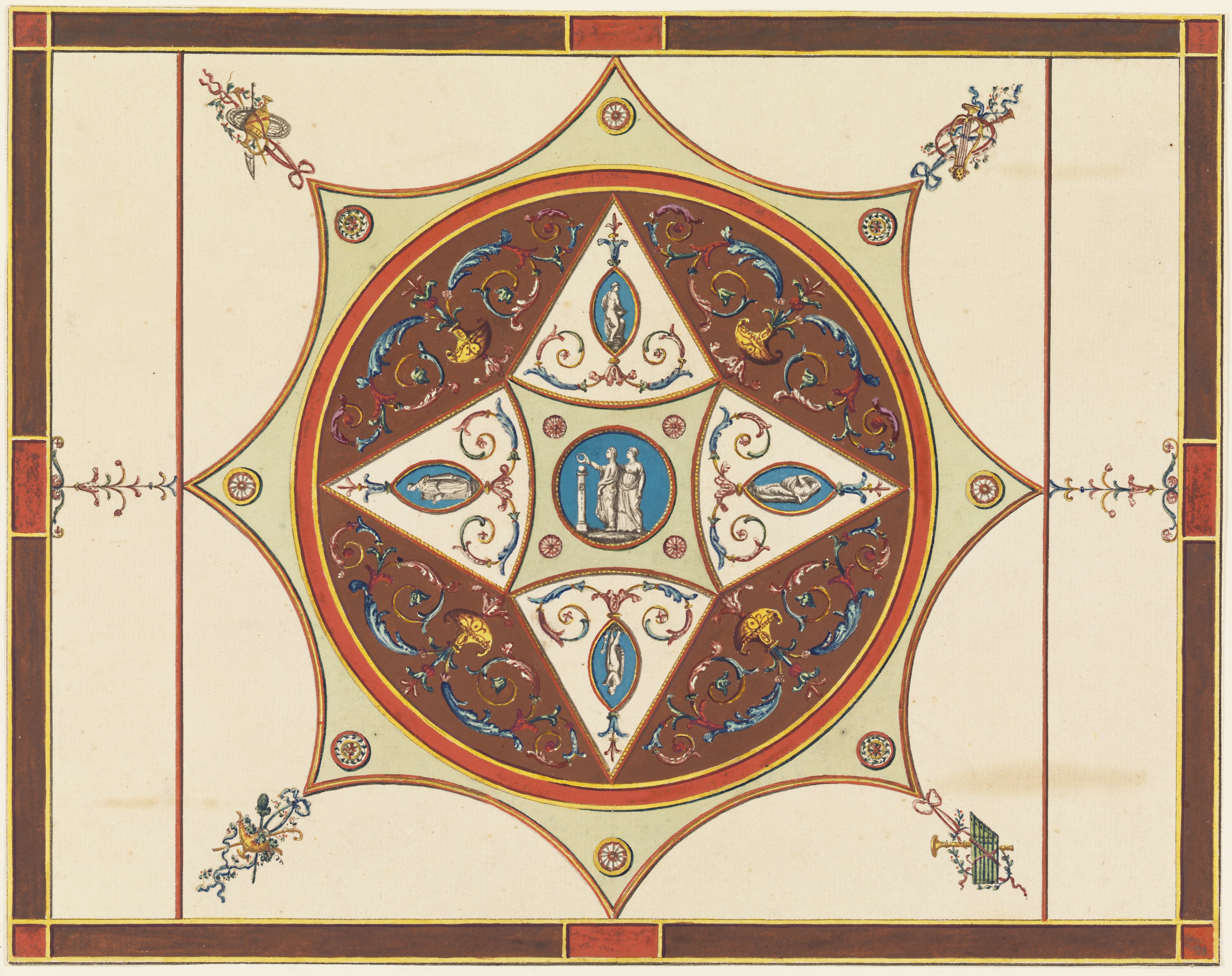 Drawing, Design for a Painted Ceiling; Designed by Frederick Crace (English, 1779–1859); England; graphite, pen and black ink, and watercolor on laid paper; 29.9 x 23.6 cm (11 3/4 x 9 5/16 in.); Museum purchase through gift of Mrs. John Innes Kane; 1948-40-164